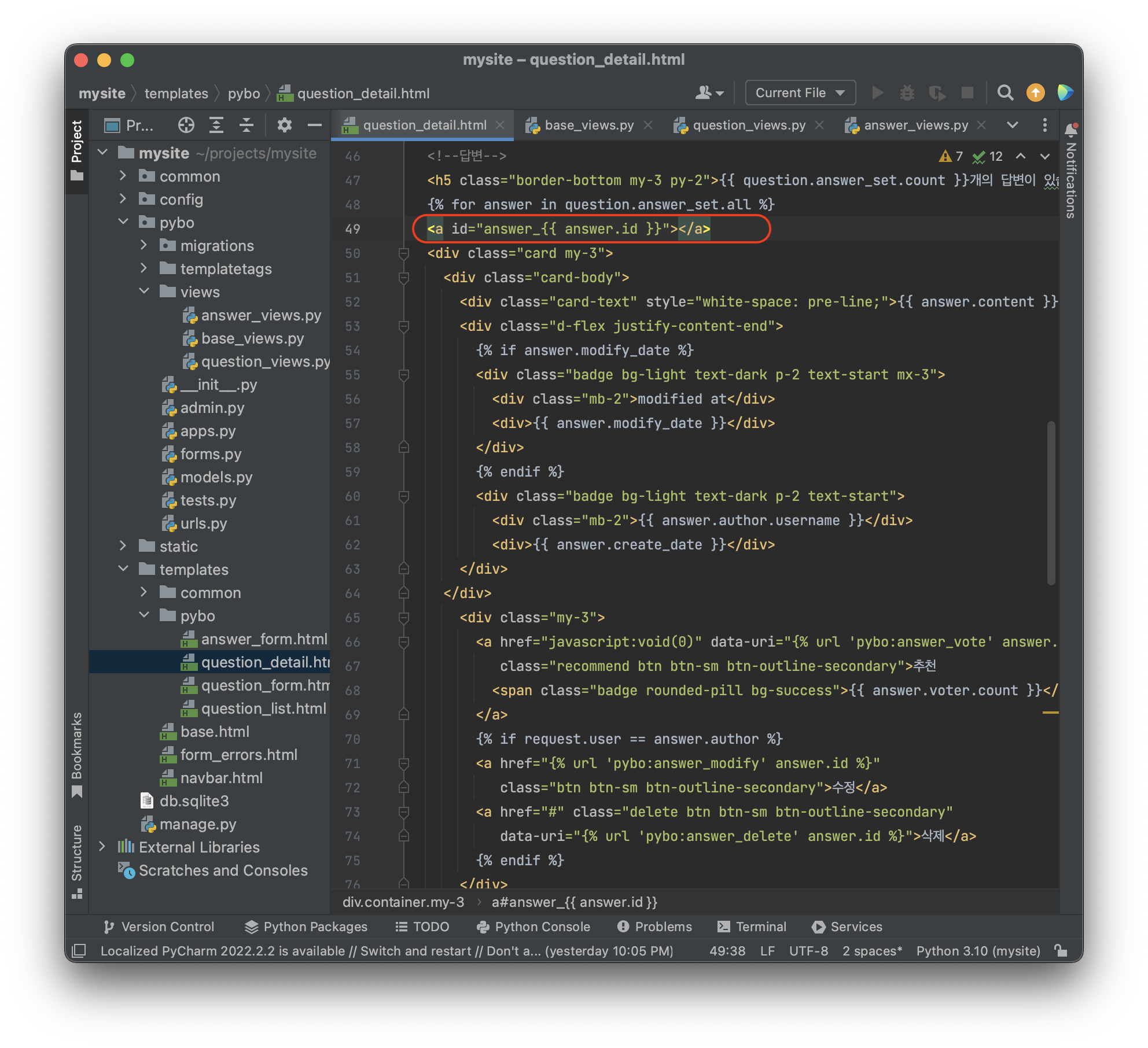 답변 작성, 수정시에이동해야할 앵커 태그를 추가했다. 답변이 반복되어 표시되는 for 문 바로 뒤에 추가했다. name 속성은 유일한 값 이어야 하므로 answer_{{ answer.id }} 같은 답변 id 를 사용했다.