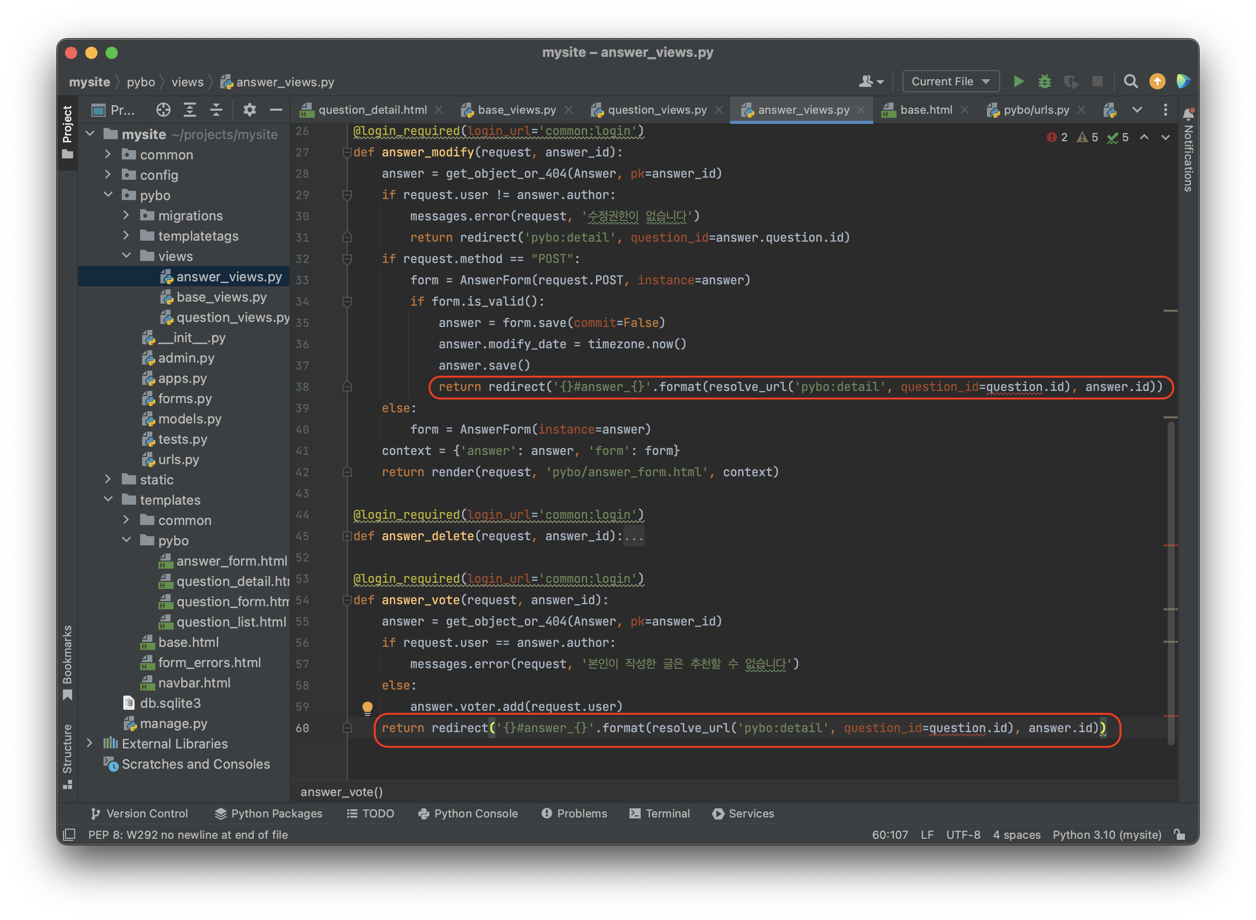 answer_views.py의 answer_create, answer_modify, answer_vote 함수도 변경해 줘야 한다.