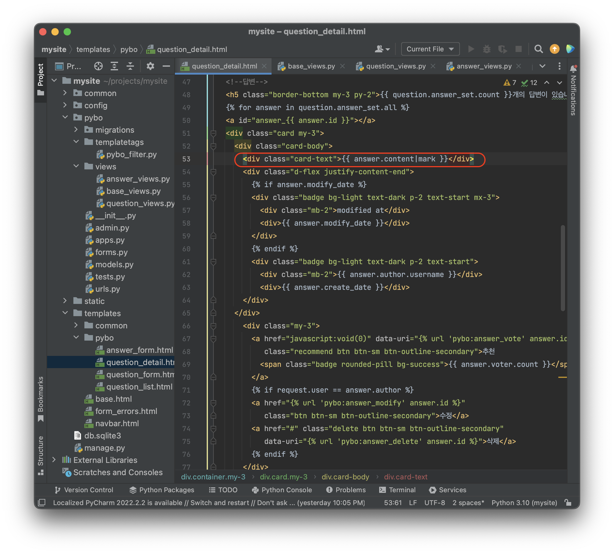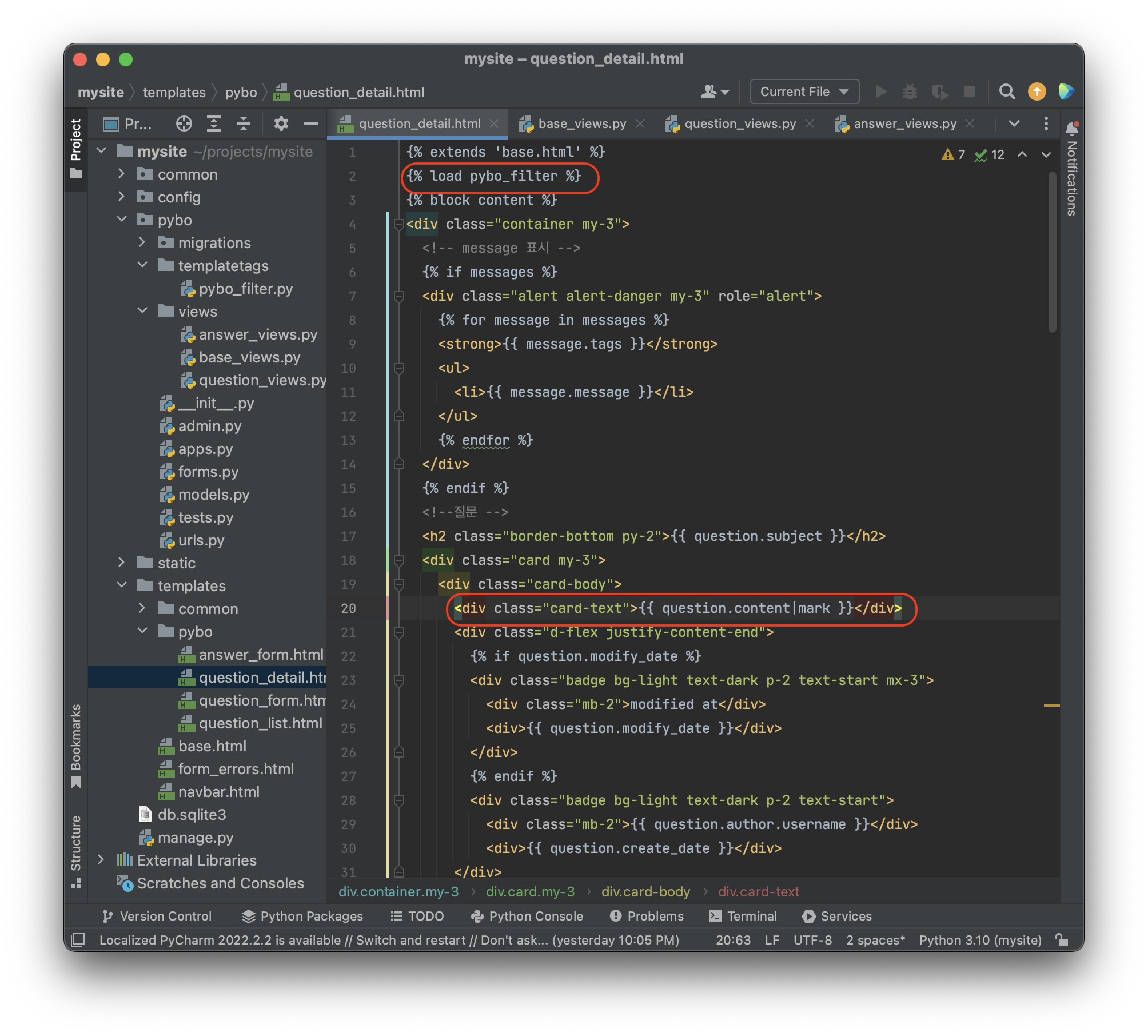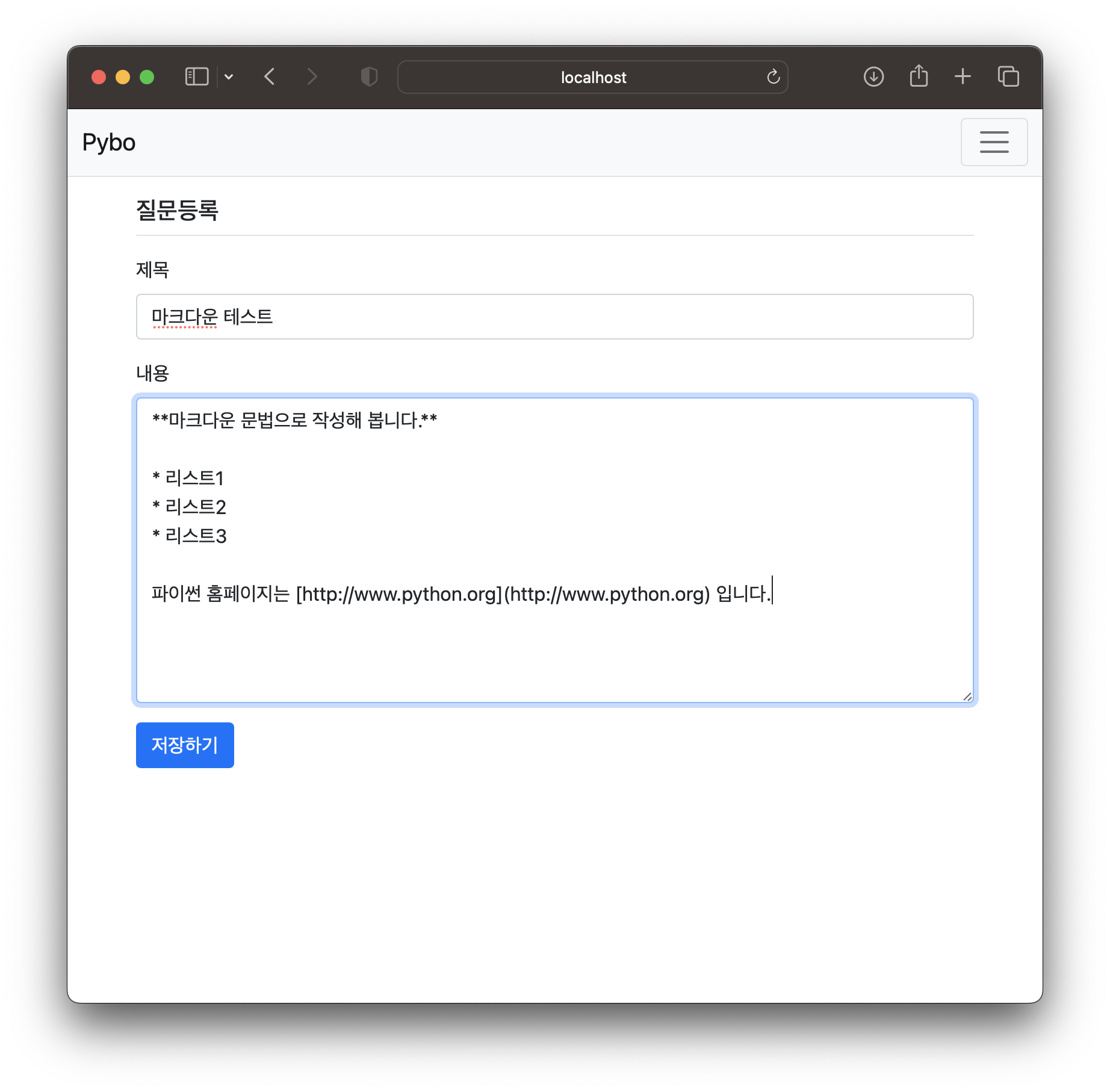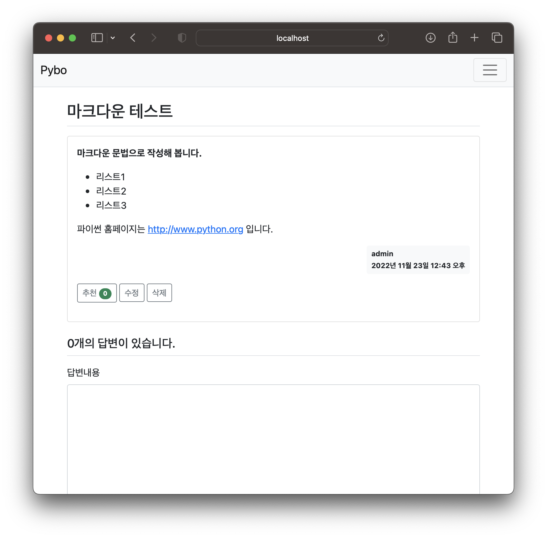 이제 질문상세템플릿에 {% load pybo_filter %} 태그를 추가하고 마크다운 필터를 적용하자