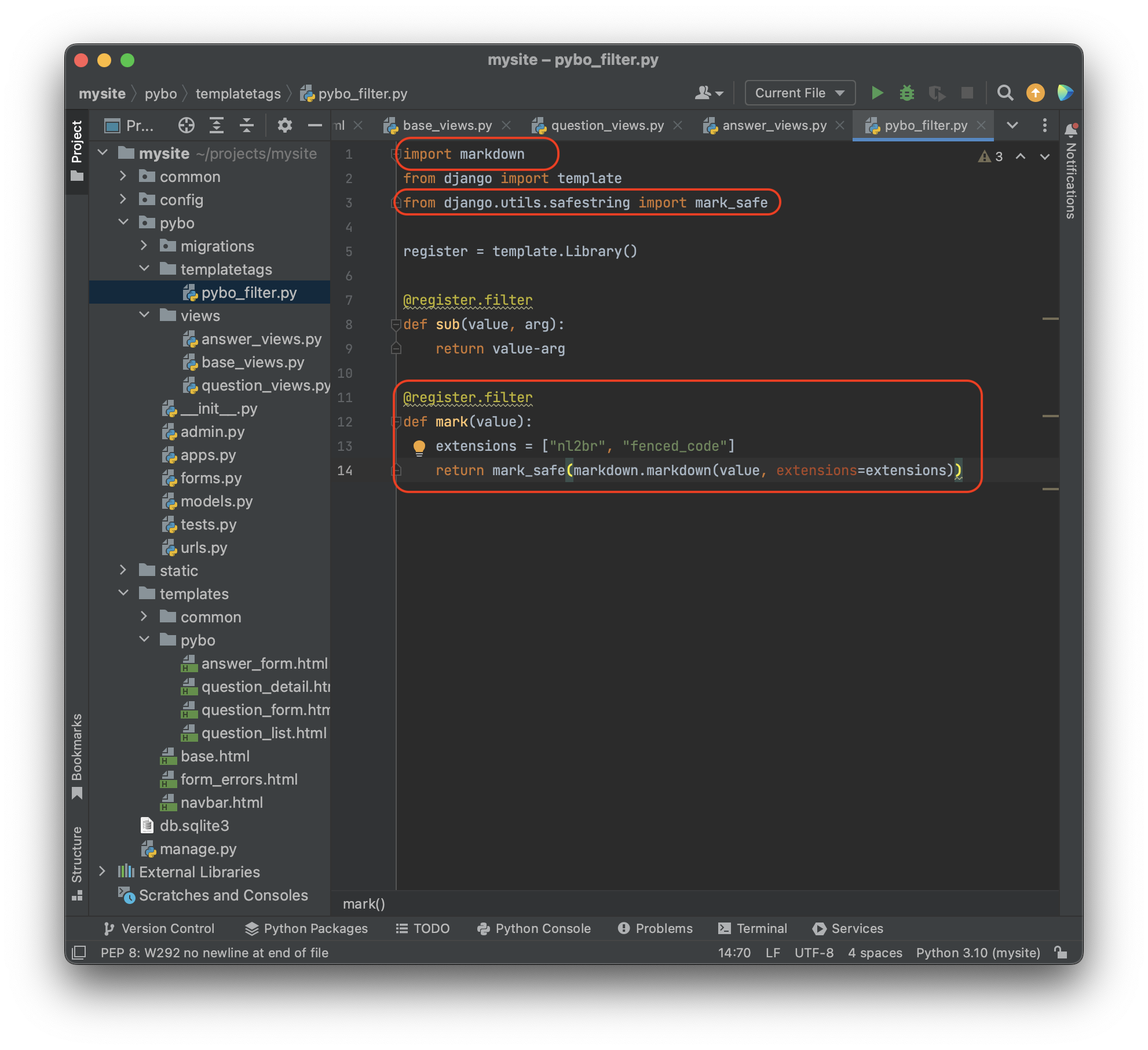 마크다운으로 작성한 문서를 HTML 문서로 변환하려면 템플릿에서 사용할 마크다운 필터를 작성해야 한다. 이전에 sub 필터를 작성했던 pybo_filter.py 파일에 다음과 같이 mark 필터를 추가하자.
