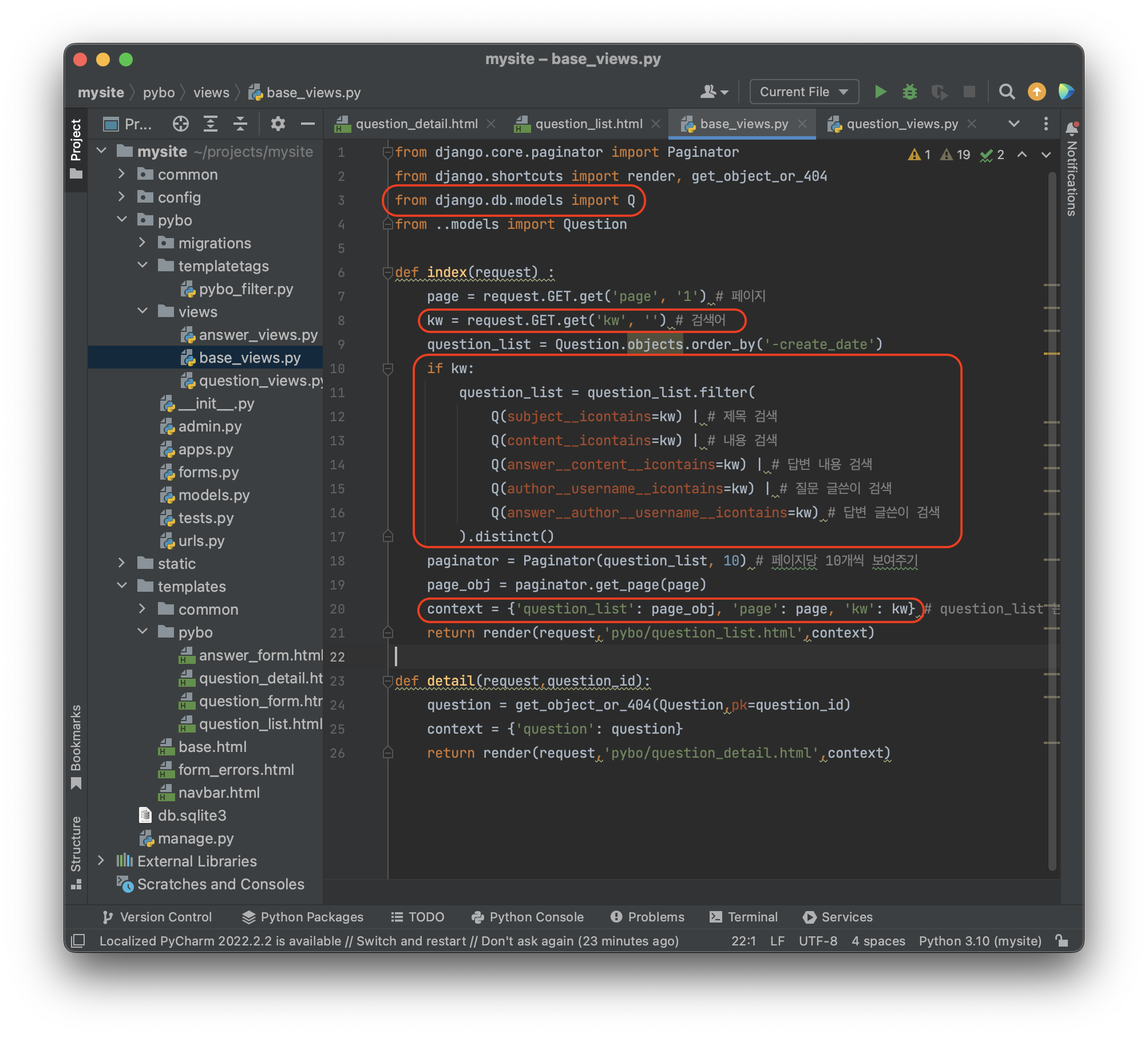 Q 함수내에 사용된 subject__icontains=kw 의 의미는 제목에 kw 문자열이 포함되어있는지를 의미한다.