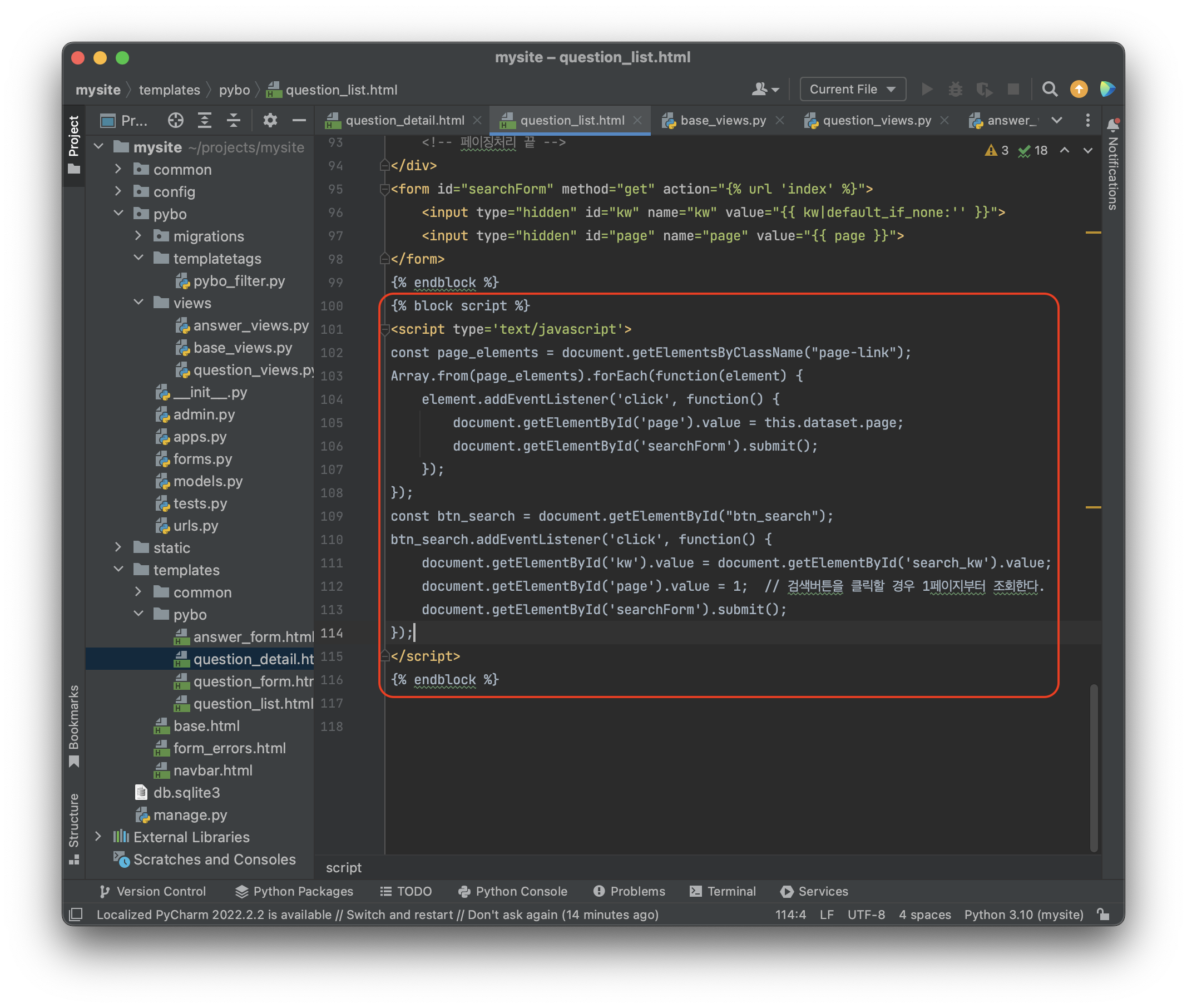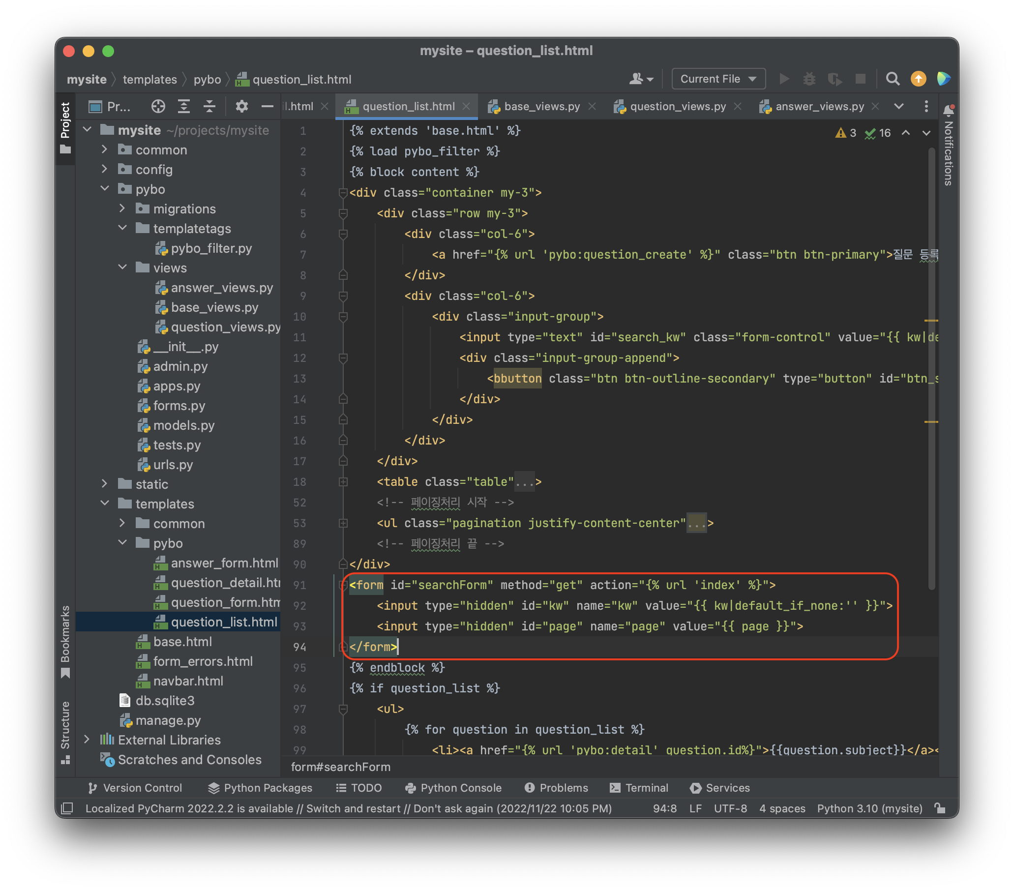 그리고 page 와 kw 를 동시에 GET 으로 요청할 수 있는 searchForm 을 다음과 같이 추가하자.projects\mysite\templates\pybo\question_list.html 에 추가하자.
