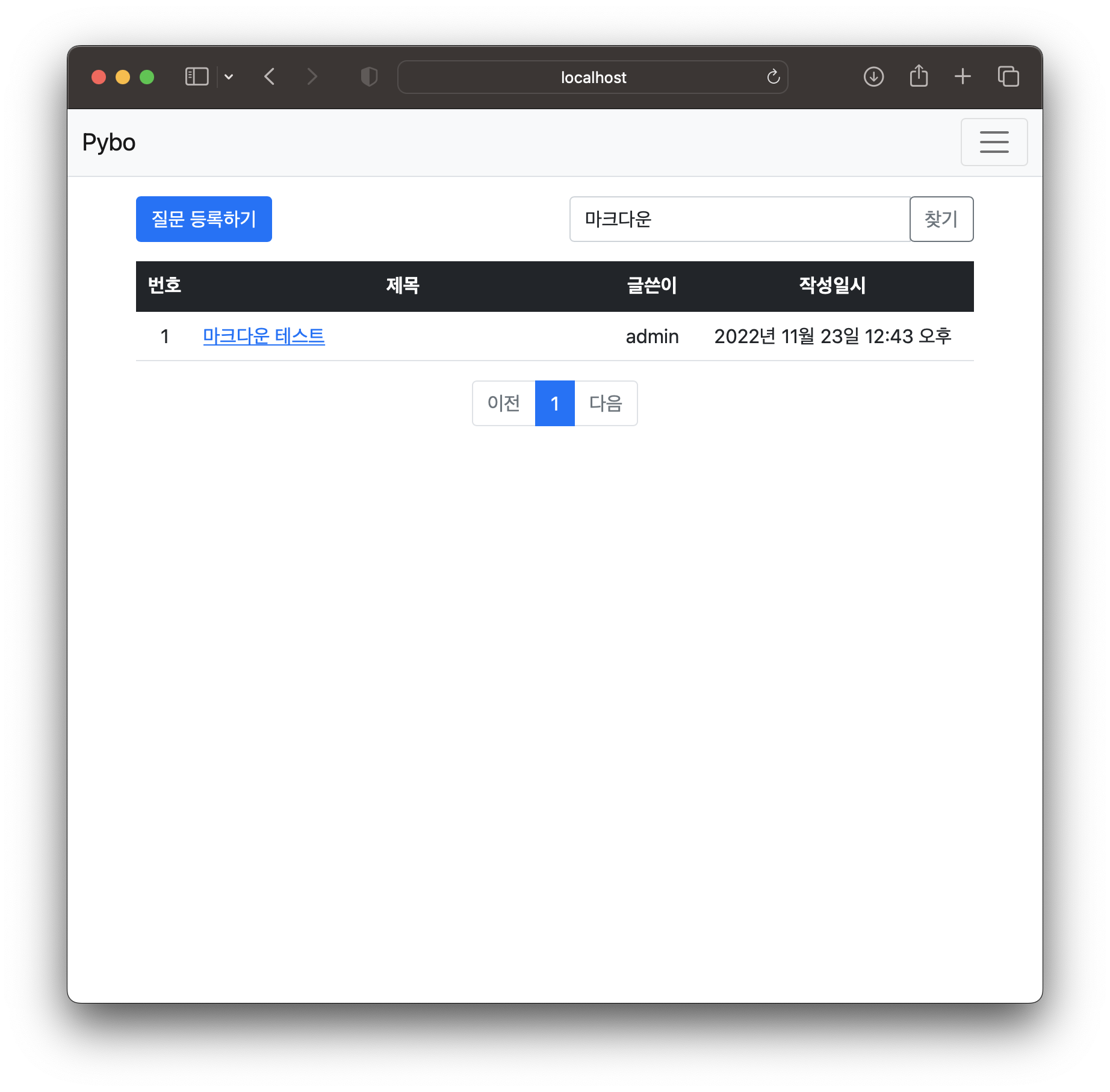 검색어에 마크다운이라고 입력한 후 찾기를 눌러보면 마크다운 이라는 제목을 가진 질문만 나온다.