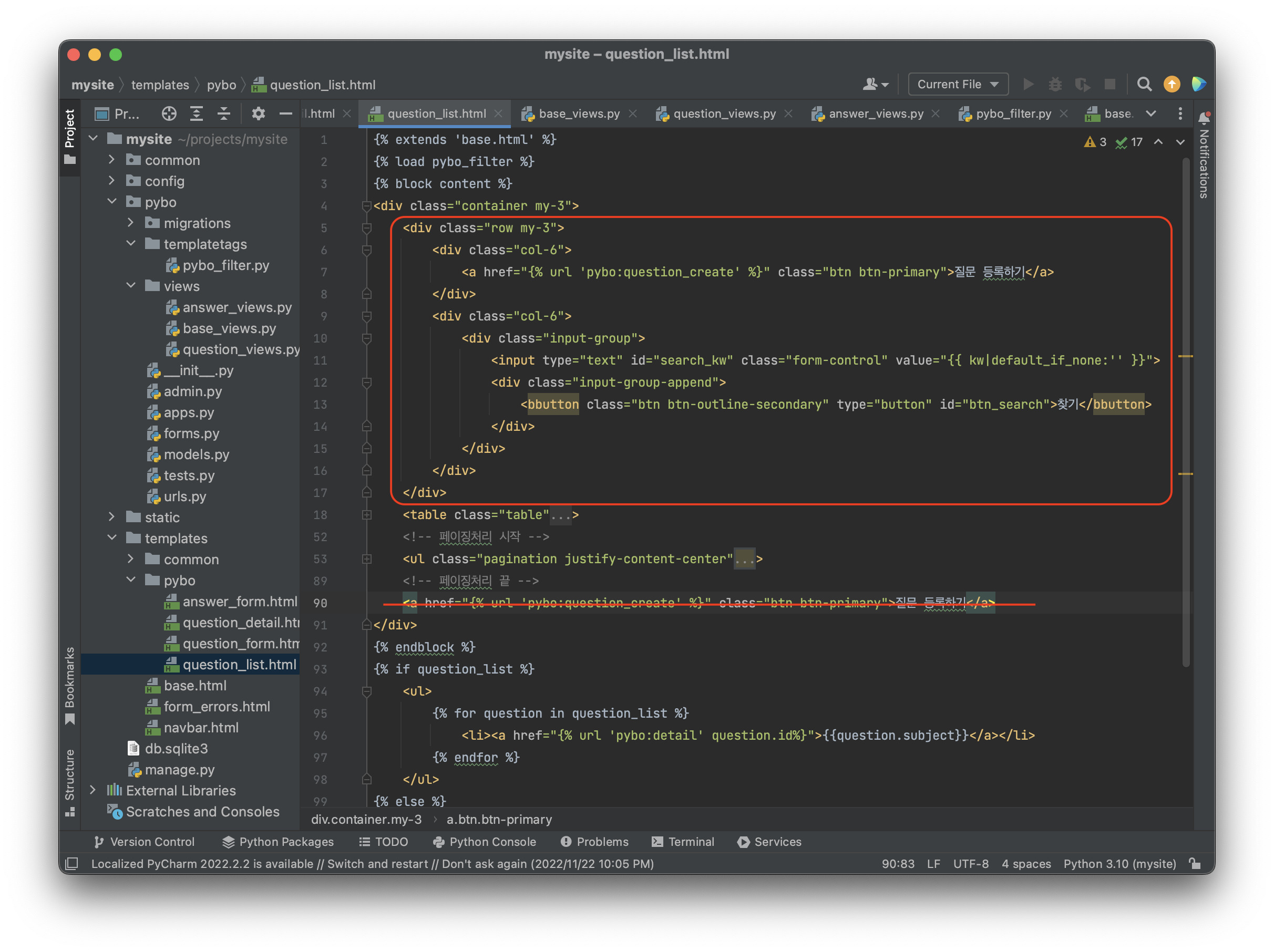 projects\mysite\templates\pybo\question_list.html 을 변경하자.