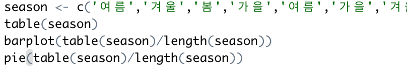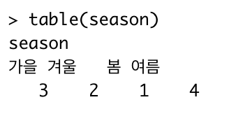 3. 좋아하는 계절에 대한 조사 결과가 다음과 같을 때 주어진 문제를 해결하기 위한 R 코드를 작성하시오