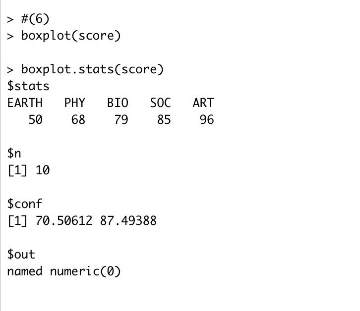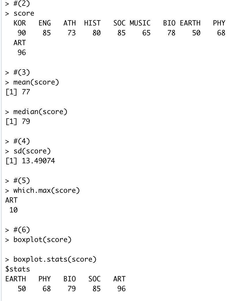 4. 학생 A의 과목별 성적이 다음과 같을 때 각 문제를 해결하기 위한 R 코드를 작성하시오.