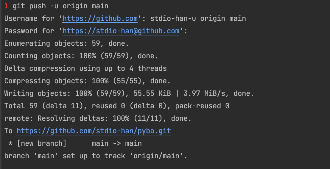 git push -u origin main 명령어를 치면 깃허브의 Username 과 Password 를 치는곳이 나오는데 Username 을 치고 Password 를 쳐야한다. 하지만 맥 기준으로는 깃허브의 비밀번호가 아닌 token을 입력해줘야한다. 이 토큰은 깃허브에서 세팅-개발자세팅-토큰 에서 토큰을 만들어서 나오는 토큰을 복사해 Password 입력칸에 붙여넣기 하면된다.