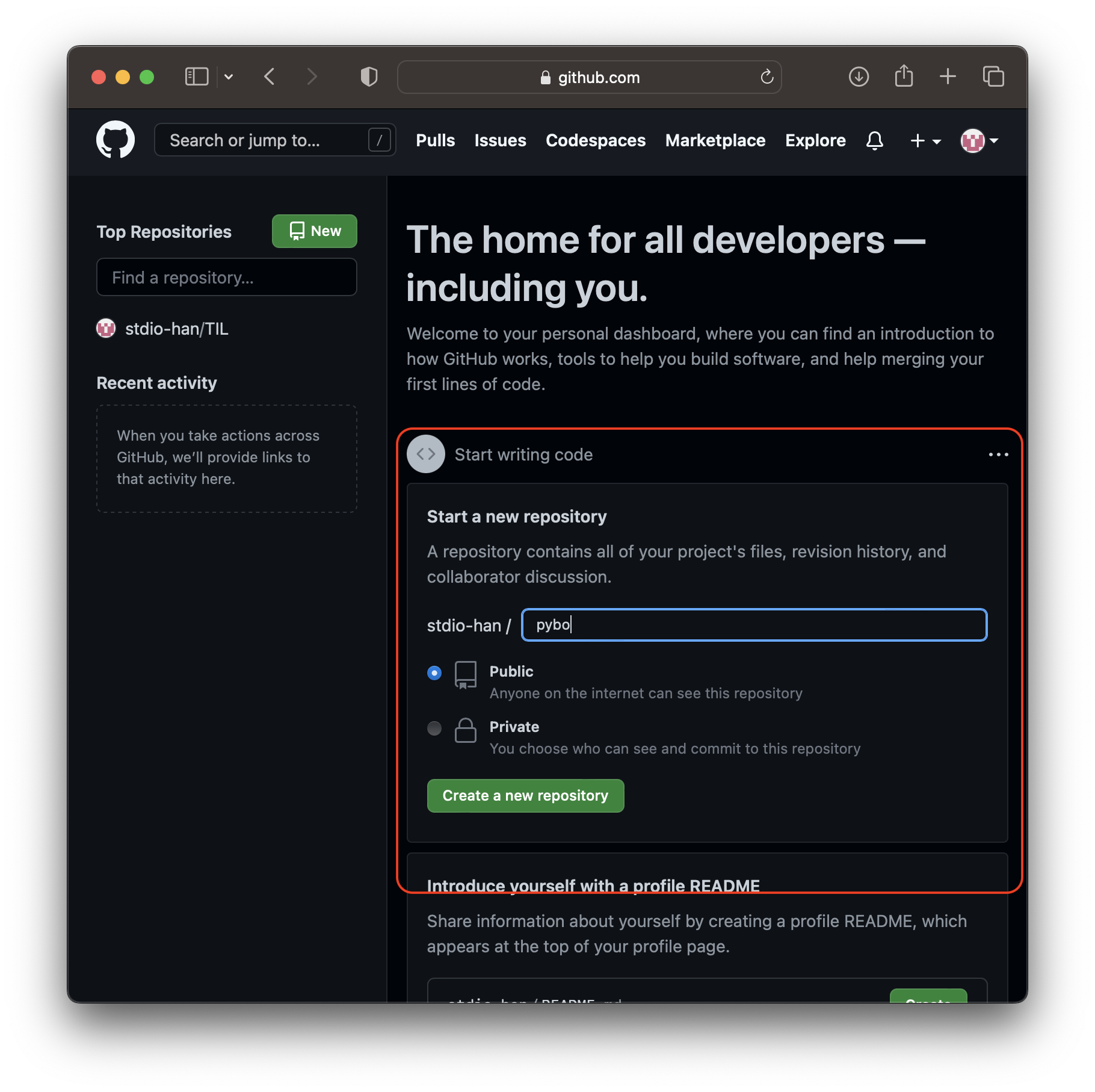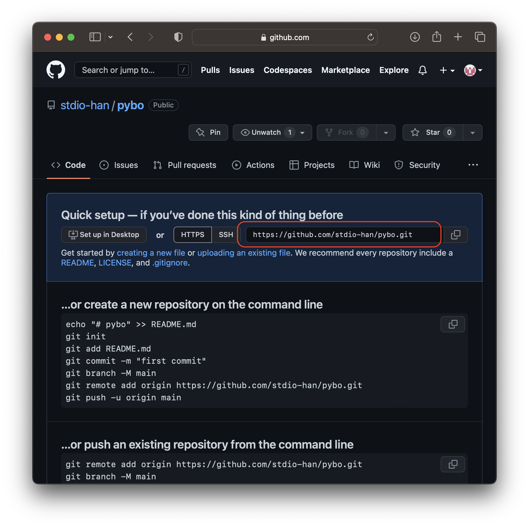 new repository 를 해서 새로운 원격 저장소를 생성하주자. 그렇게 하면