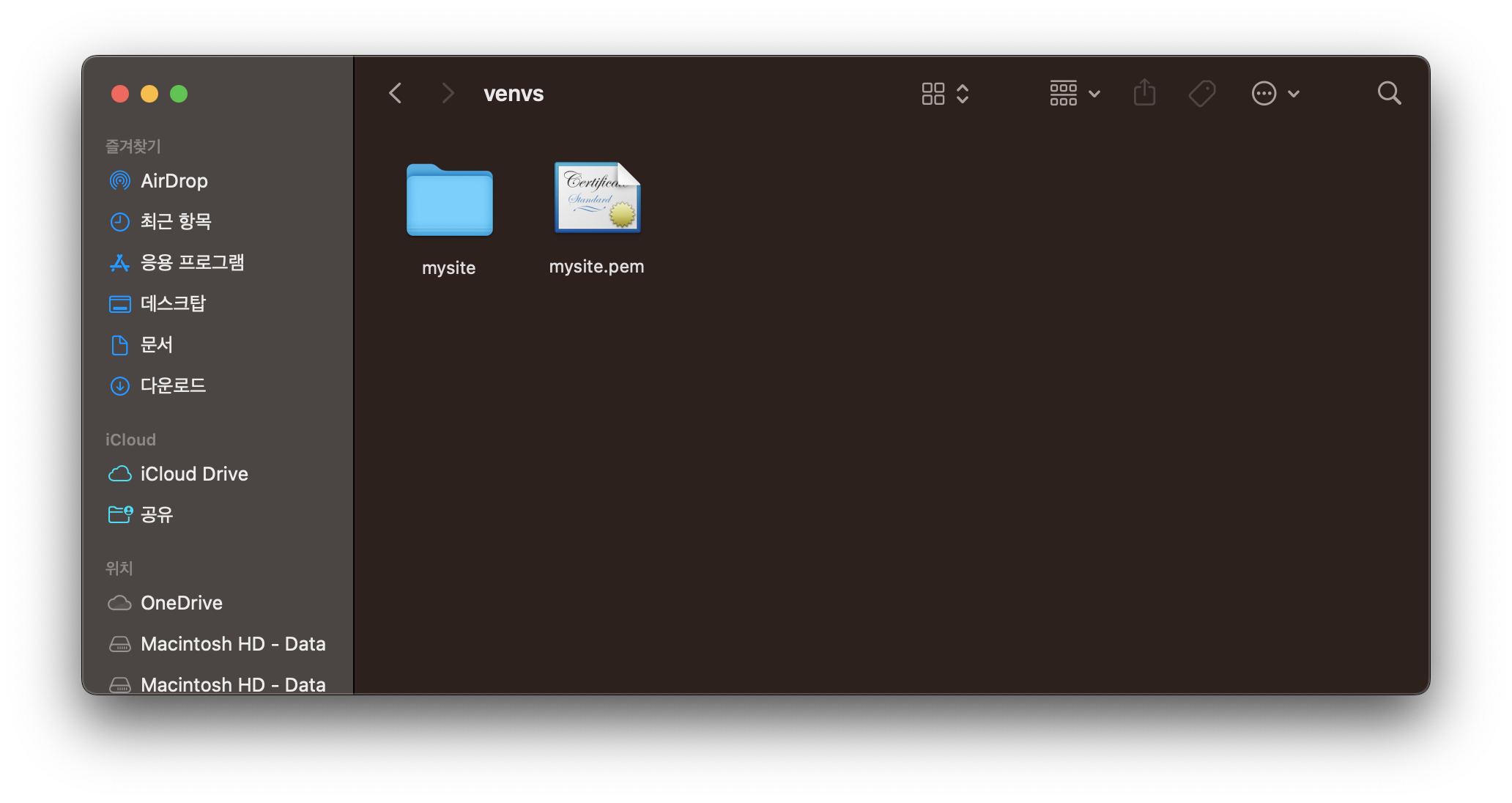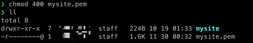 그리고 터미널을 열어 .../vens 위치까지 이동 후 chmod 400 mysite.pem 명령을 해주자.