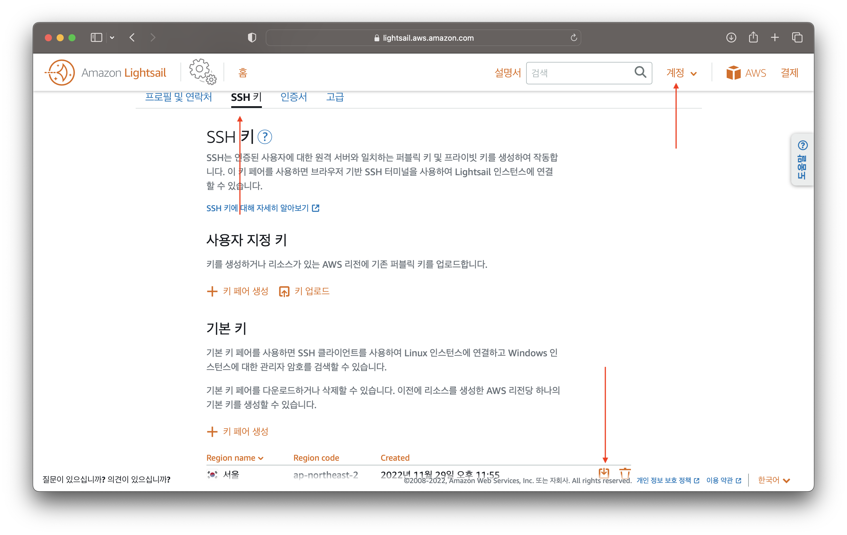 우 상단에 계정 버튼을 누르면 나오는 화면에서 SSH키 탭에서 아래에 있는 버튼을 눌러 프라이빗 키를 다운로드하자.