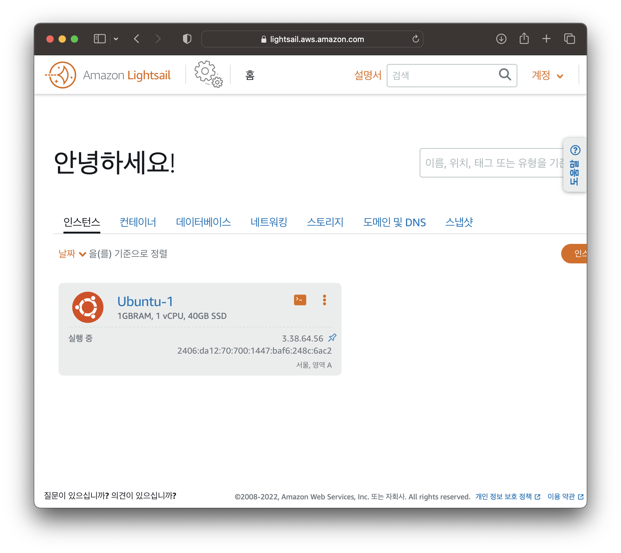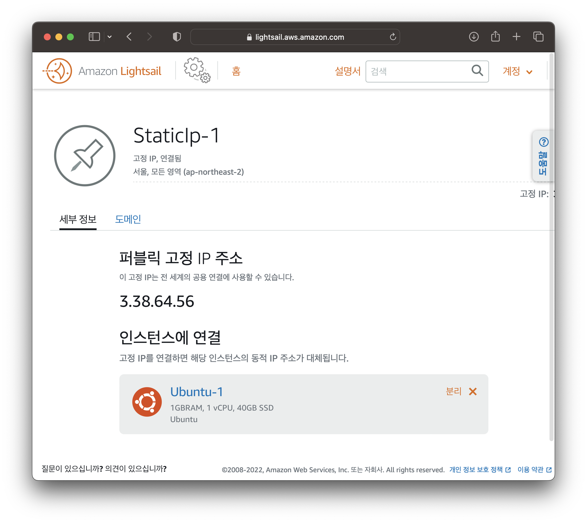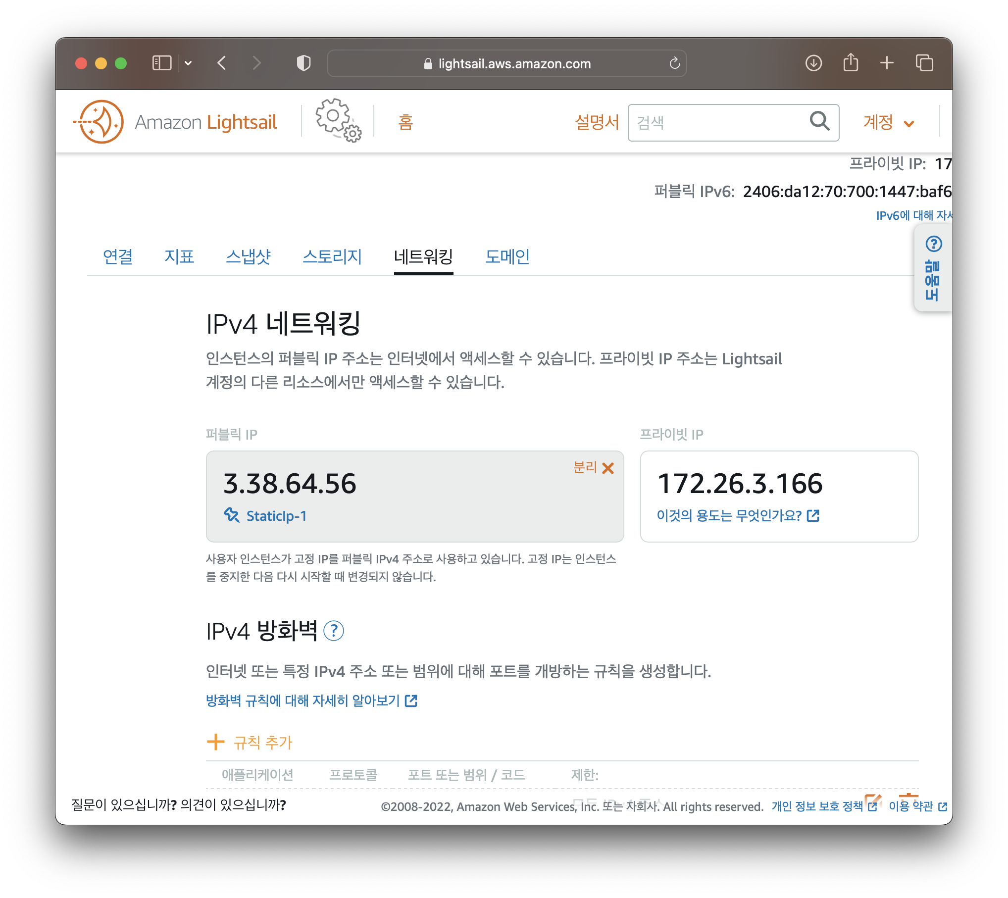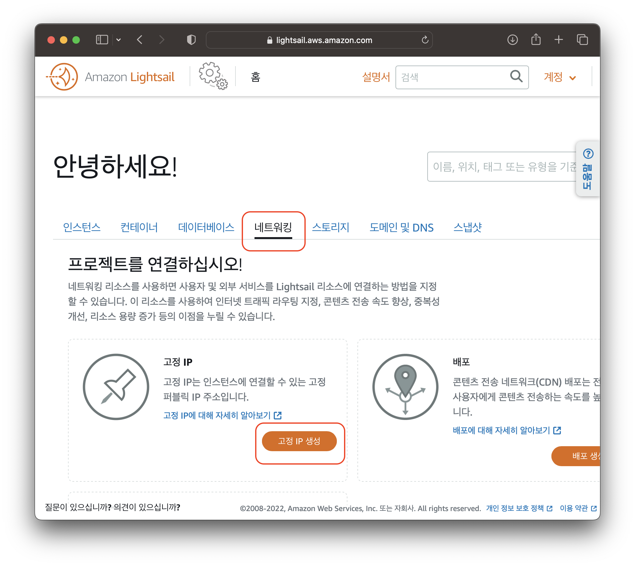 먼저 AWS 라이트세일의 메인화면에서 네트워킹 탭을 눌러 고정 IP 생성을 누르자.