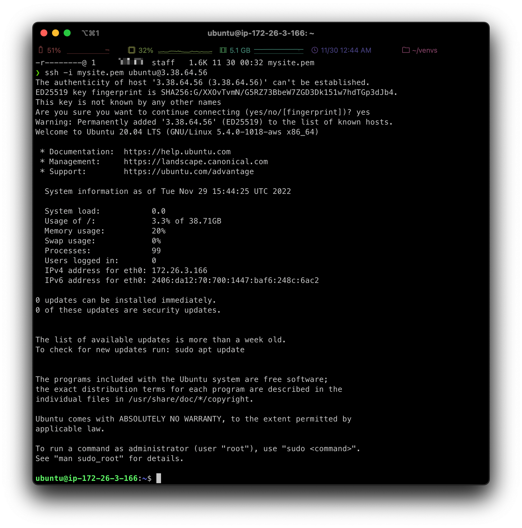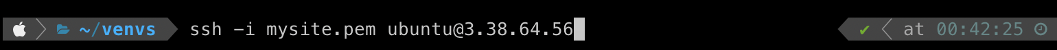 마지막으로 ssh -i mysite.pem ubuntu@본인의 고정 IP 주소 를 입력하면