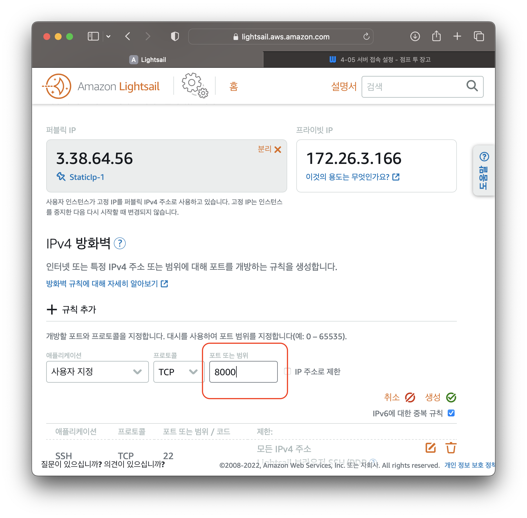 포트 또는 범위에 8000을 누른 후 생성을 누르자. 이렇게 하면 8000 포트의 방화벽 해제를 했으므로 외부에서 고정 IP 의 8000 포트로 접속이 가능해진다.