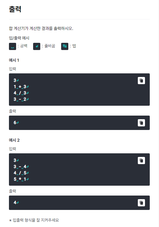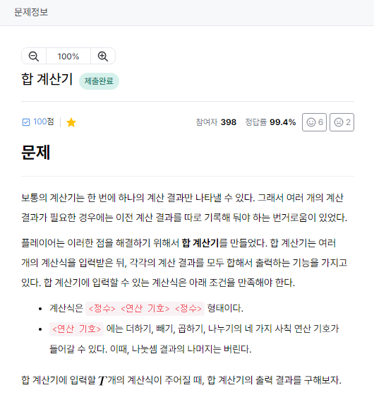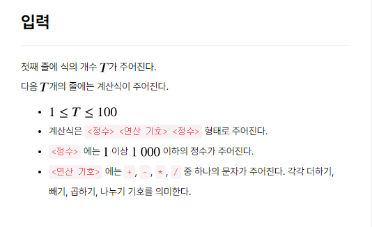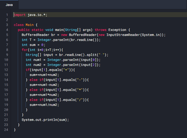 단순 구현 문제로 if문을 통해서 사칙연산을 해결한다. 사칙연산을 통해 나온 값이 sum에 모두 더한 후 마지막에 sum을 출력한다. 구현은 잘 되었지만 if문 없이 알고리즘을 짜면 더 깔끔해질것같다.