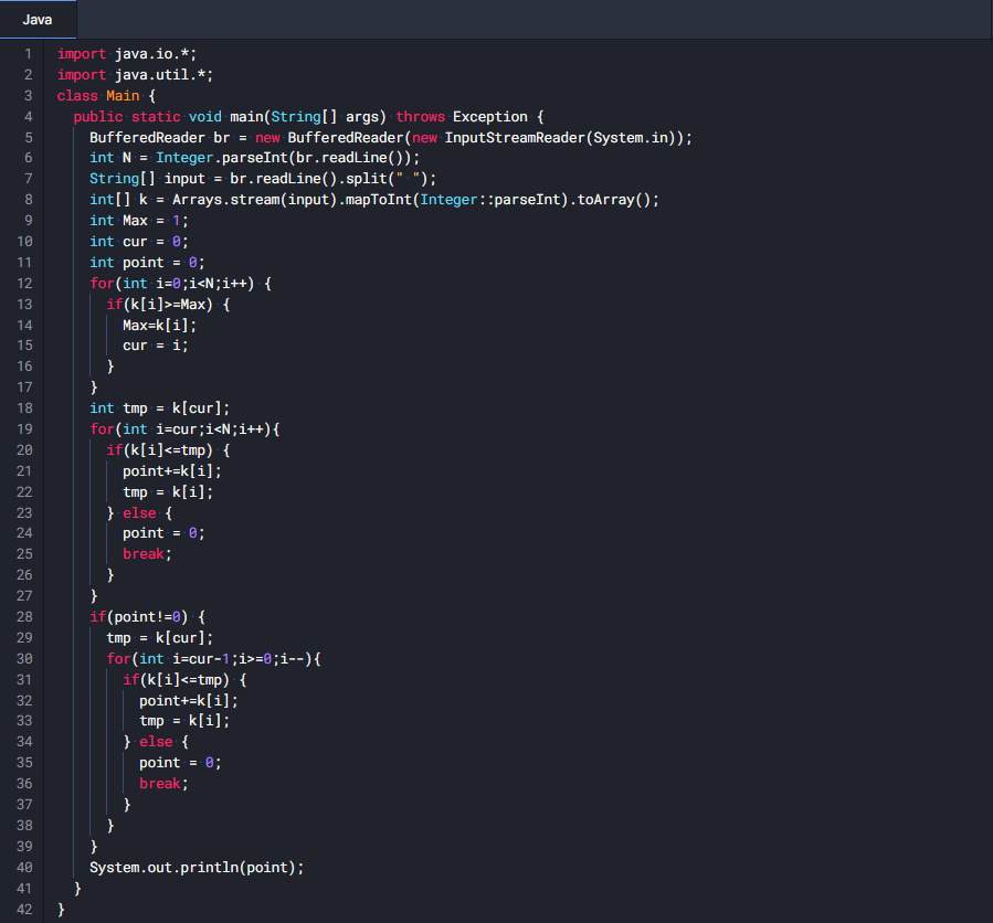 세 번째 for문은 저장한 인덱스-1 을 기준으로 내려가며 문제 조건에 맞는지 파악한다.