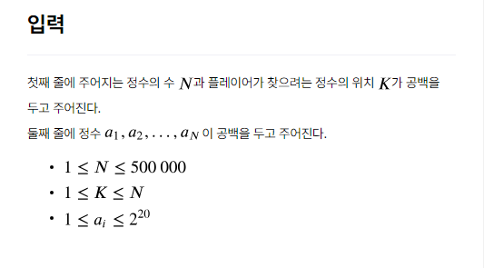 처음에 풀었을 때의 코드이다. 풀면서도 내가 뭘 하고있는지 점점 수렁으로 빠져들어갔다. 문자열로 입력을 받아서 그걸 다시 정수배열로 변환하고 정렬하고, 오름차순 정렬이기 때문에 for문으로 요소 끝에서부터 불러들여 Integer.toBinaryString 이라는 정수를 2진수 문자열로 변환하는 함수를 써서 문자열배열 a에 담았다. 사실 이렇게 할거면 배열에 담을 필요도 없었다. 아무튼 원래 문자열의 길이에서 그 문자열에 있는 1을 공백으로 치환한 문자열의 길이를 빼서 count 정수 에 담은 후 map 을 이용해 입력한 정수, 1의 갯수를 내림차순으로 정렬한 것이다. 그렇게 한것을 list에 다시 담아서 value를 기준으로 내림차순해 K-1번 요소를 출력한다. 지금보면 도대체 뭘 하고싶은건지 모르겠지만 신기하게도 테스트케이스는 통과가 된다.