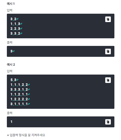 저번의 문제에서 약간 심화된 버전의 문제이다. 저번 문제를 풀이를 보며 풀어서 그런지 어느정도는 혼자서 풀 수 있었다. 하지만 요새 구름톤 트레이닝하며 강의가 매일 많고 과제도 많아져서 구름톤 챌린지 문제를 볼 시간이 부족해서 점점 문제가 밀리고 있다. 놀시간을 줄이며 최대한 둘다 가져가보려고 하고있다.