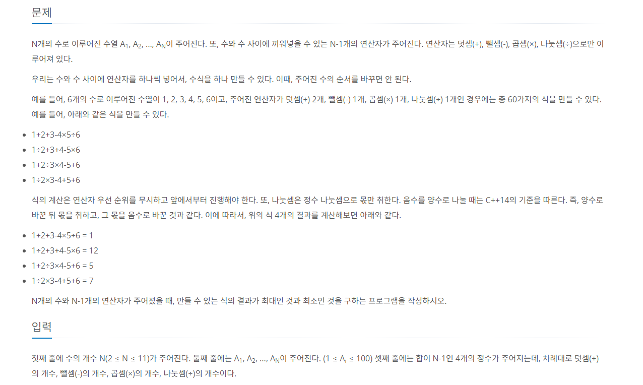 그림의 예가 약간 잘못된것같고 이상하지만 참고하고 보자. 그림을 예로 들어보자면 입력값이 첫째 줄에 3, 둘째 줄에 2 3 4 셋째 줄에 1 1 1 1을 입력받았을 경우의 대략적인 그림이다. 첫번째 숫자부터시작해 2 + 3 - 4 순서대로 계산을 하고 그 다음은 2 + 3 * 4, 그 다음은 2 + 3 / 4 순서대로 진행하게 된다. 숫자가 더 많거나 연산자가 더 많을 경우에도 그림과 같이 진행된다고 보면 된다.