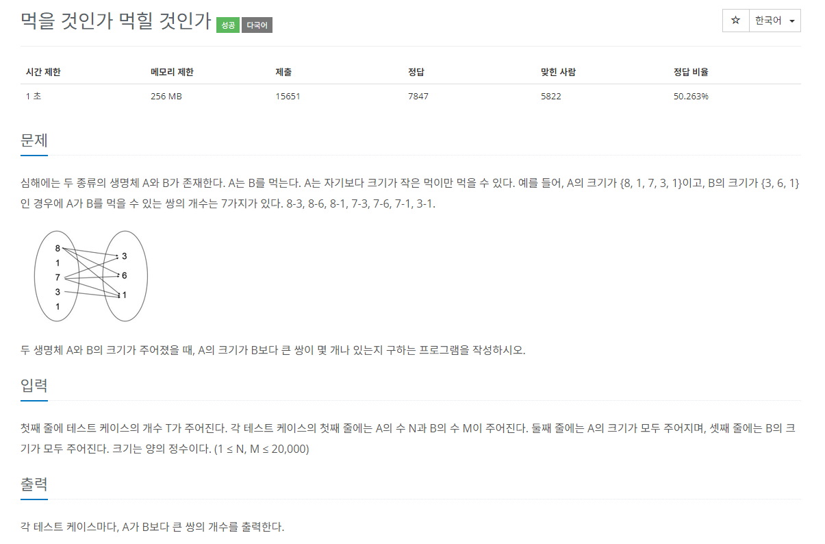 for문을 적게 사용하고 싶어서 B를기준으로 이분탐색을 했다. A가 B를 먹을 수 있는 쌍을 구하는게 아닌 B가 A에게 먹힐 수 있는 쌍을 구했다.