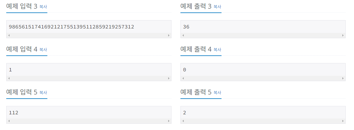 첫째 줄에 문자열 S가 주어진다. 문자열 S는 1보다 크거나 같고, 9보다 작거나 같은 수로만 이루어져 있고, 길이는 50보다 작거나 같은 자연수이다.