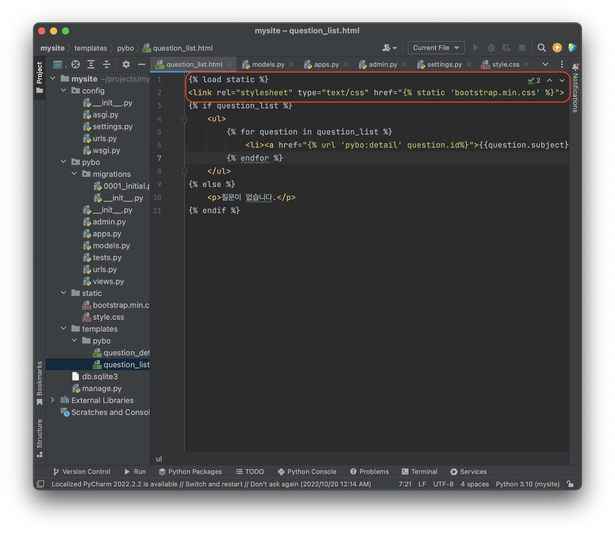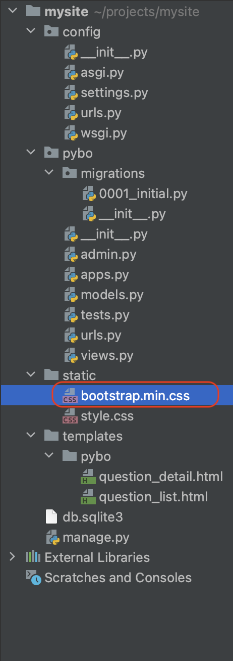 \Users\<사용자명>\ptojects\mysite\static\bootstrap.min.css 위치로 복사해 준다.