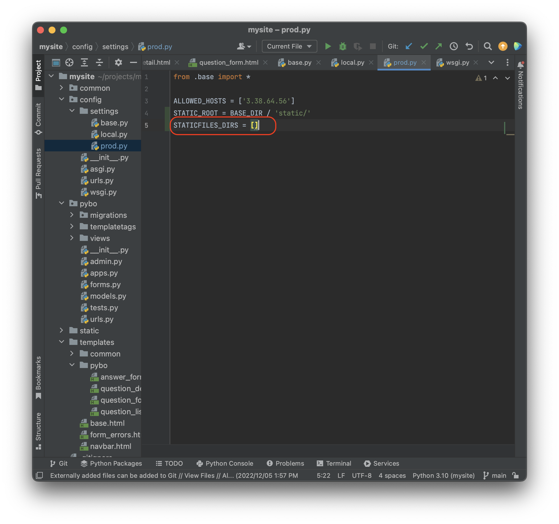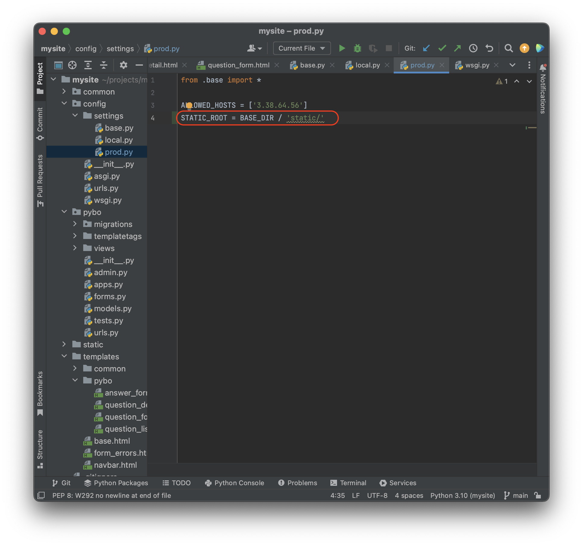먼저 projects\mysite\config\settings\prod.py 파일에 STATIC_ROOT 항목을 추가하자.
