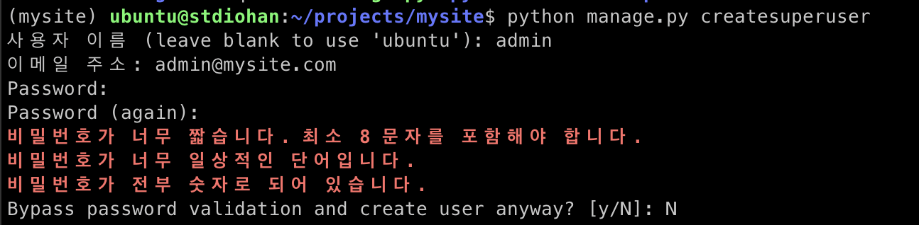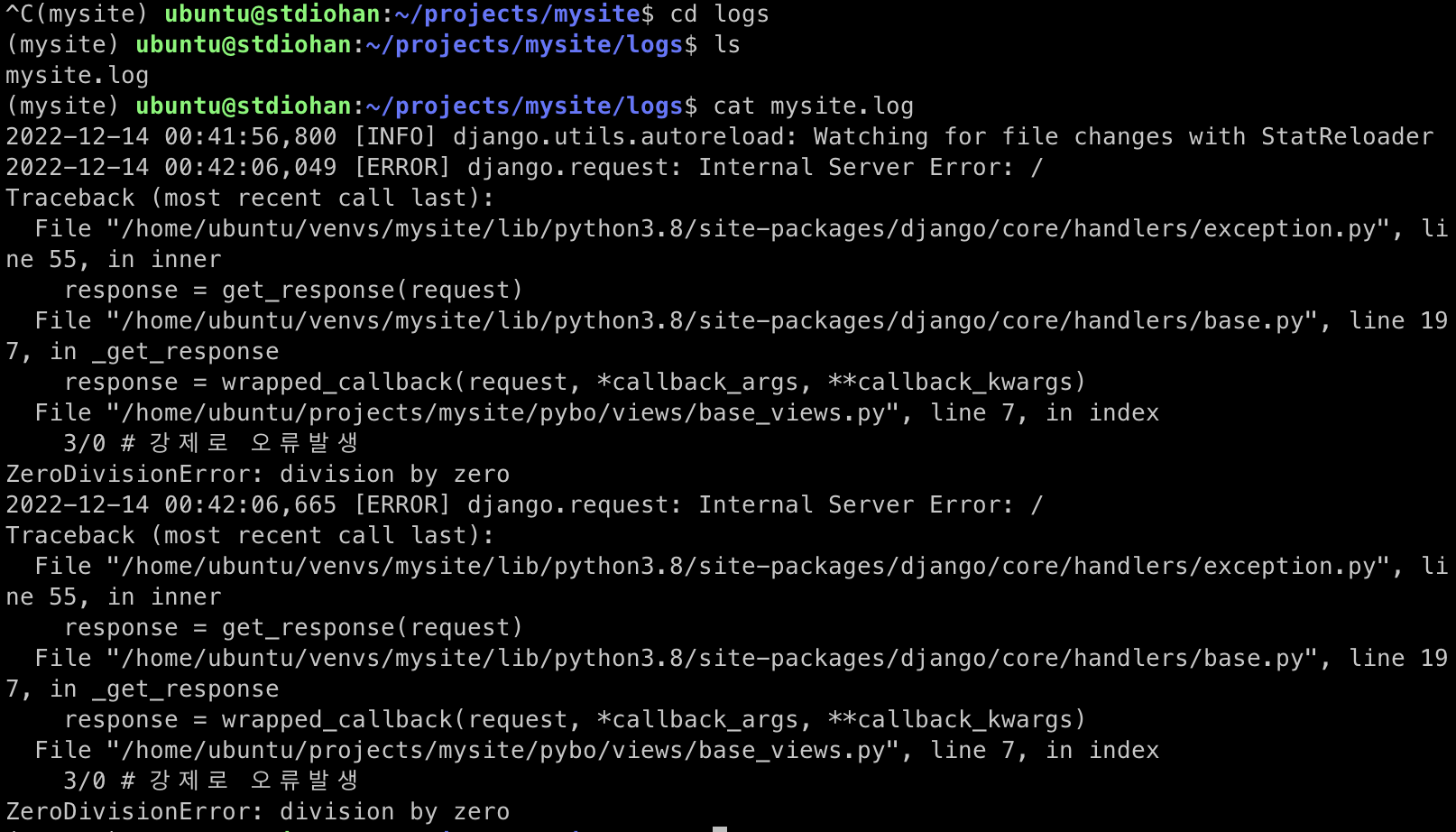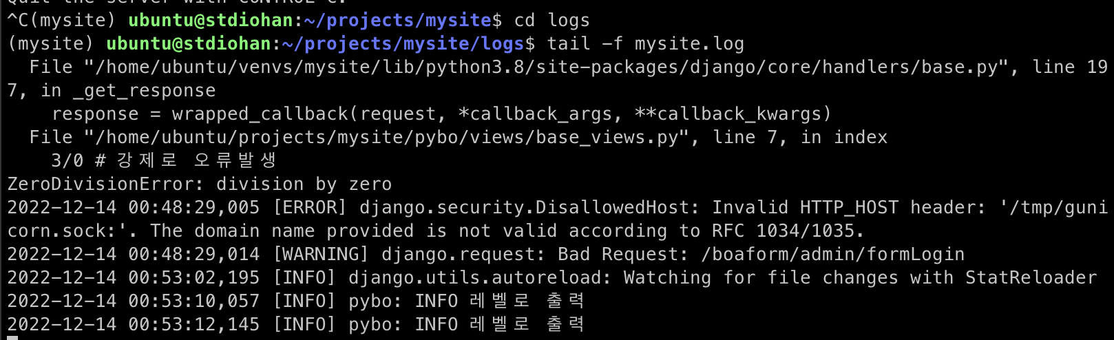 어떤 오류가 발생했는지 로그파일에 출력된다. 앞으로는 tail -f mysite.log 로 로그를 확인하자. 이 명령을 하면 mysite.log 파일에 로그가 깧일 때마다 로그의 내용이 자동으로 출력된다.