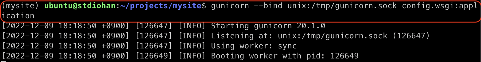이번엔 gunicorn --bind unix:/tmp/gunicorn.sock config.wsgi:application 명령을 했다. 잘 실행됬으니 종료하자.