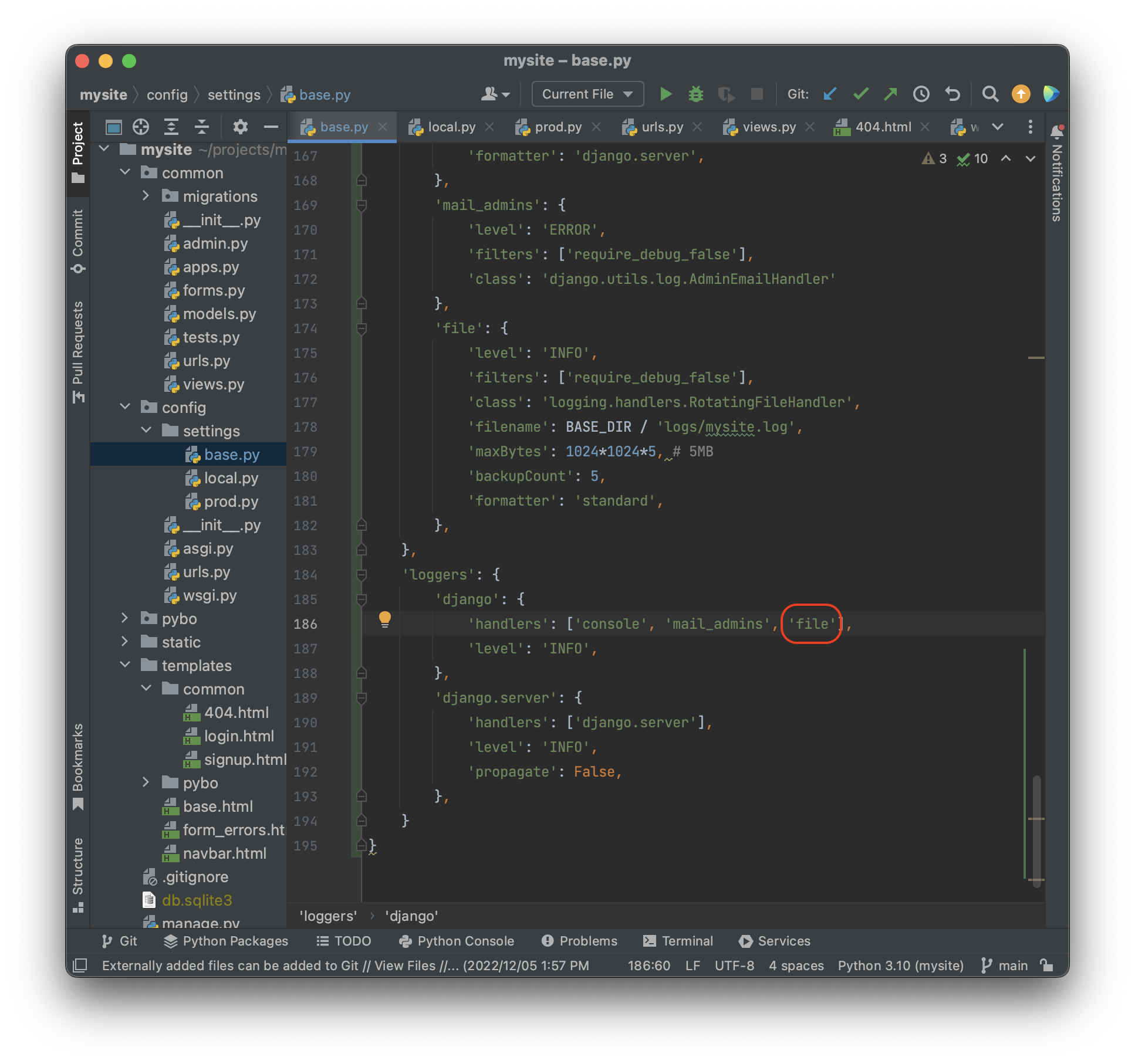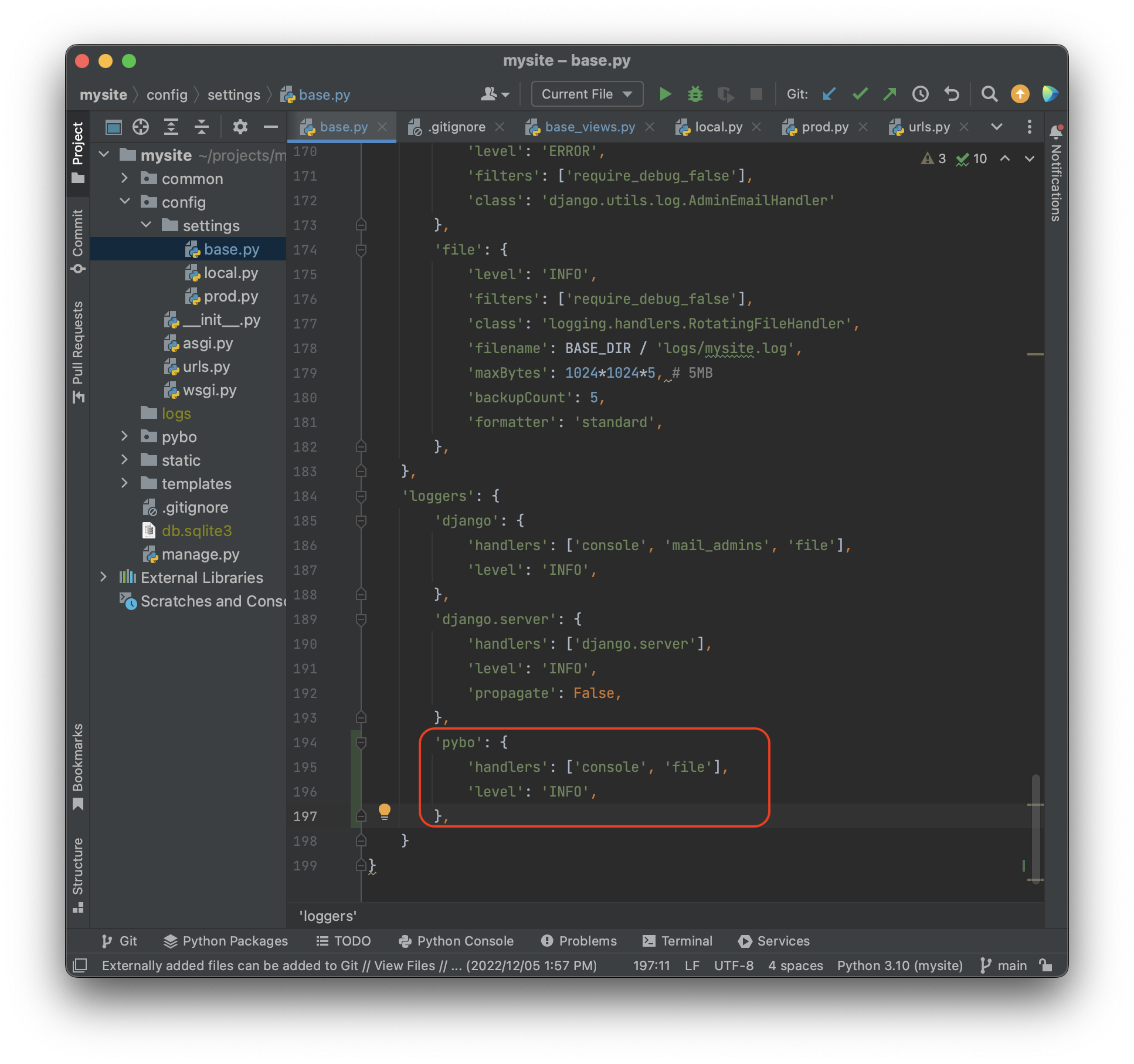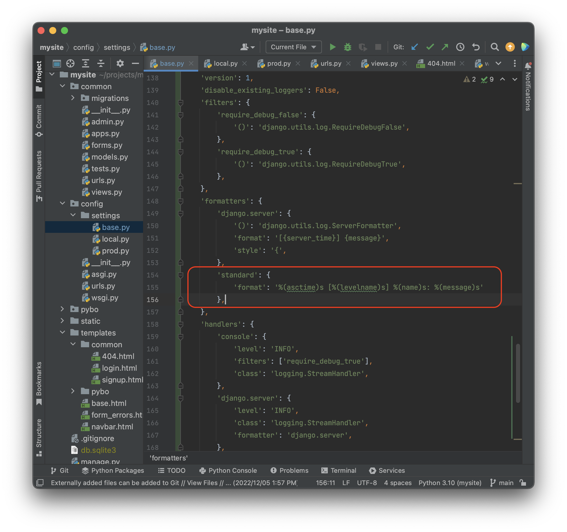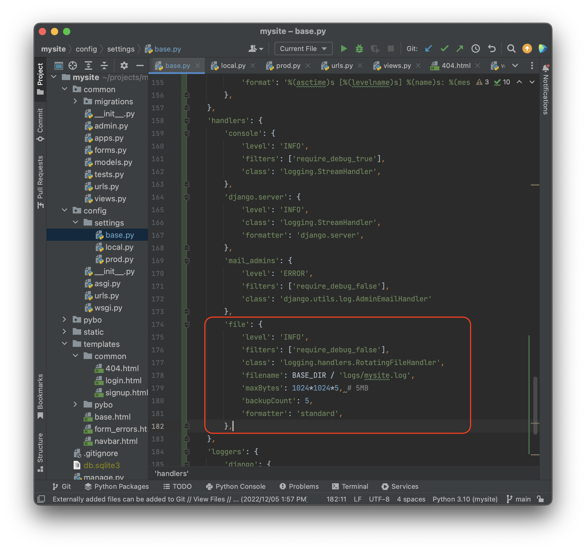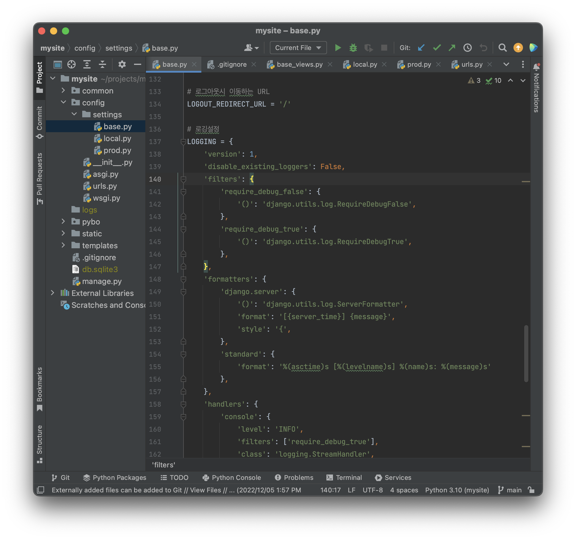 이 파일들을 적용하기위해 먼저 projects\mysite\config\settings\base.py 에 위에 적힌 DEFAULT_LOGGING 을 복사하자.