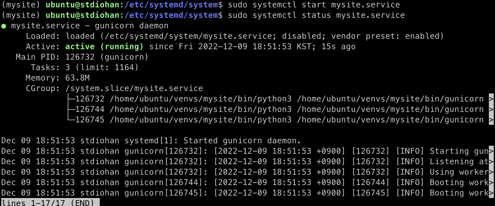 sudo systemctl start mysite.service 명령을 해보자.