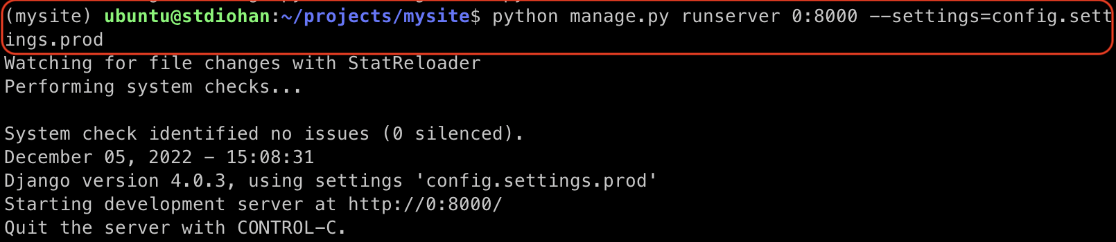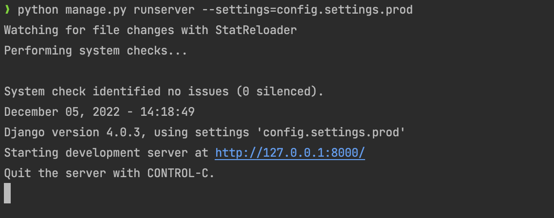 --settings=config.settings.prod 옵션을 추가해 서버를 구동하고 테스트를 해보면 잘 작동한다.