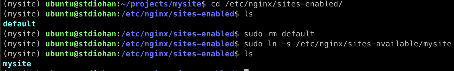 sudo ln -s /etc/nginx/sites-available/mysite 로 링크한후 ls 로 확인해보면 링크 되어있다.