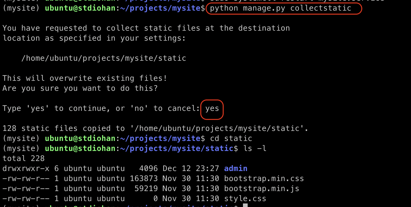 yes 를 입력해 진행하면 복사가 성공되었다는 메세지가 출력된다. static 디렉토리로 이동 후 ls -l 로 확인해 보면 정적파일들이 다 있는것을 확인할 수 있다.