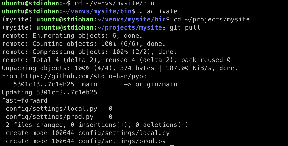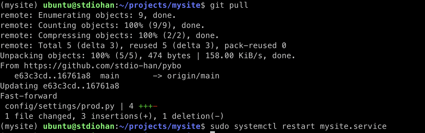 git pull 로 내려받은 후 서버에 프로그램이 변경되었으므로 Gunicorn 을 재시작 하기위해 sudo systemctl restart mysite.service 명령을 해주자.