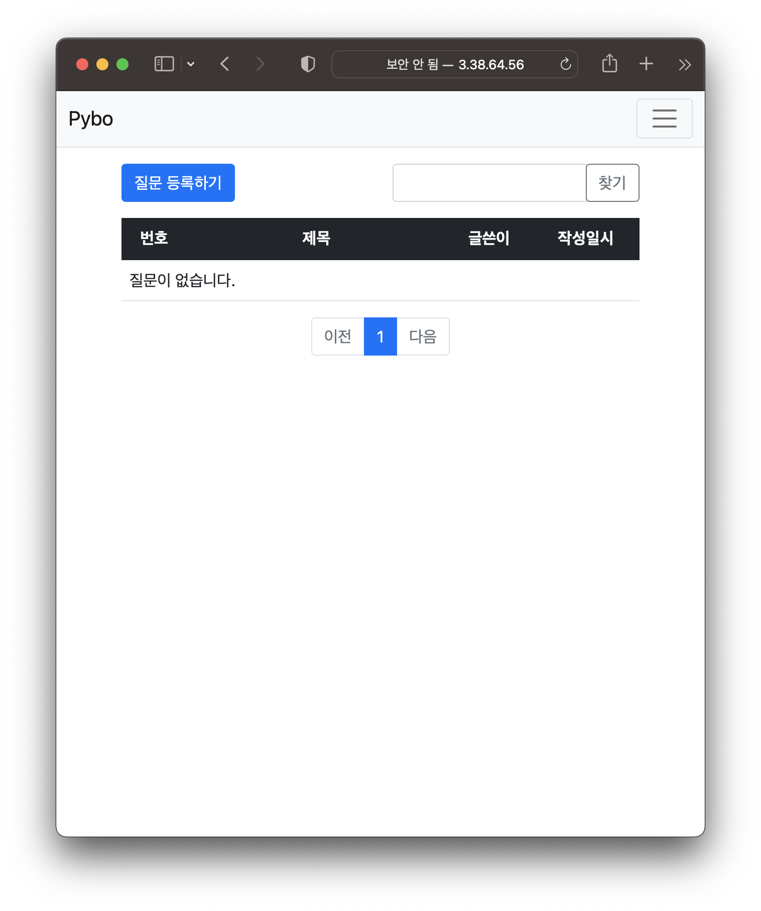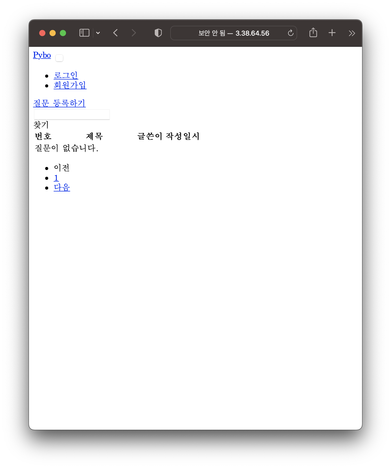 이상하게 보일텐데 그 이유는 gunicorn 이 정적파일을 못읽었기 때문이다. 파이보는 bootstrap.min.css, bootstrap.min.js 등은 정적 파일인데 정적파일을 못 읽었기 때문이다. 일단 잘 작동하는것을 확인했으므로 control+c 로 구니콘을 종료하자.
