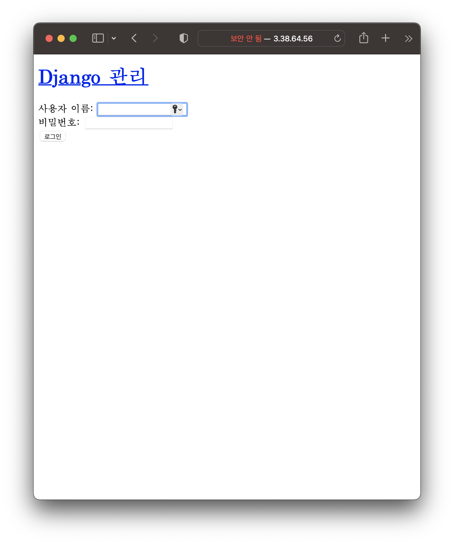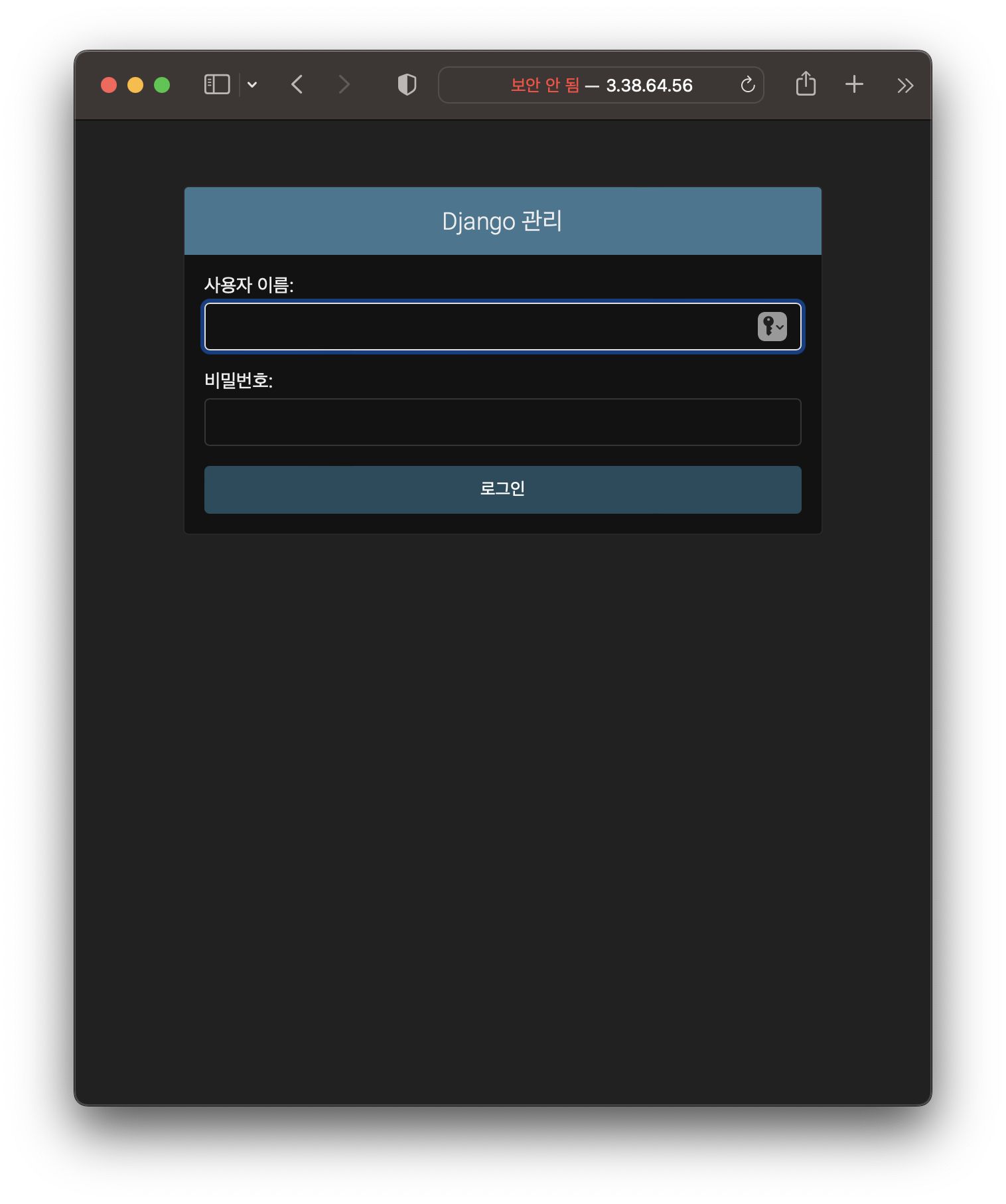 너무 쉬운 비밀번호로 생성하려하면 재확인 메세지가 나온다. 그리고 http://고정ip/admin 로 접속해보자.