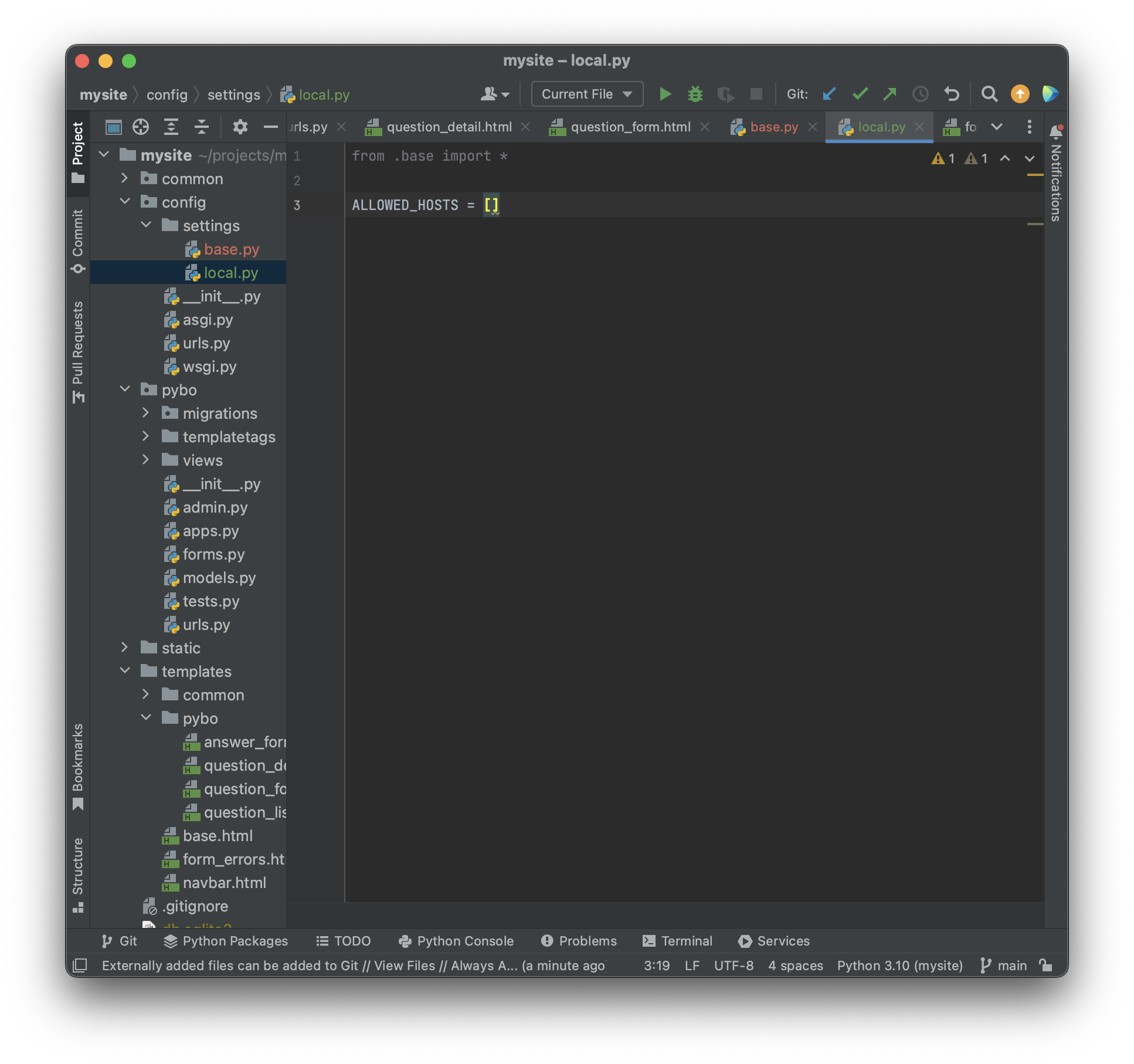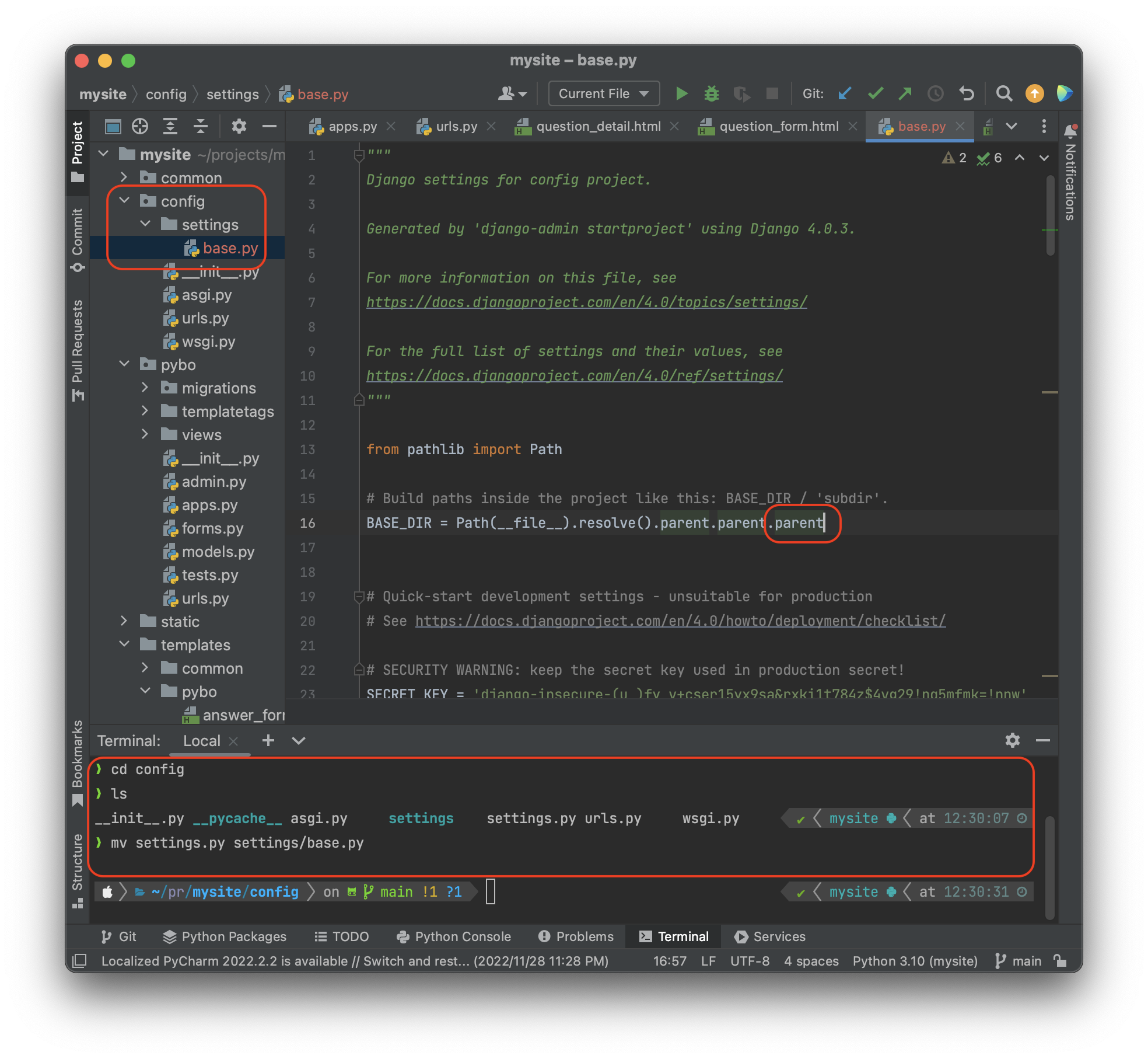 mv settings.py settings/base.py 명령어로 settings/base.py 로 이름을 변경해 옮긴 후. 옮긴 base.py 를 사진과 같이 수정해준다.