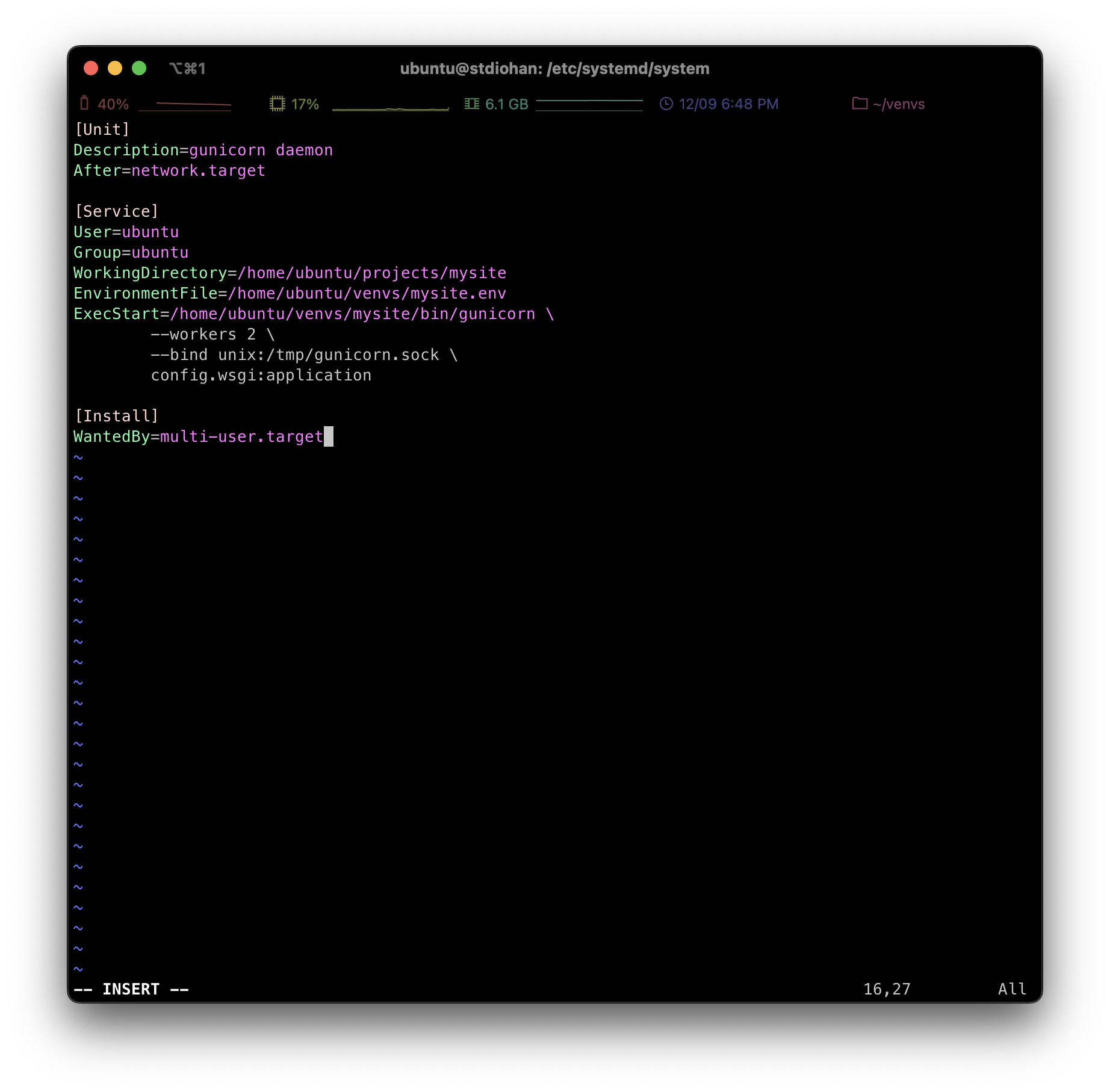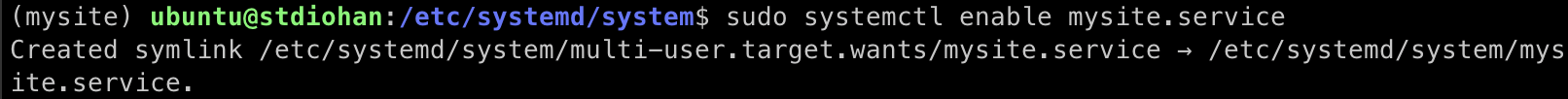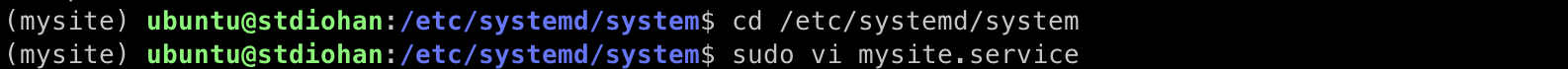 내용 한줄만 작성하자. 그리고 /etc/systemd/system/ 디렉토리에 mysite.service 파일을 생성하자. 이 파일은 시스템 디렉토리에 저장해야 하므로 sudo vi mysite.service 같이 관리자 권한으로 작성해야 한다.