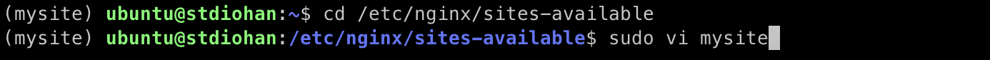 그리고 /etc/nginx/sites-available 디렉토리로 이동하자. 이 디렉토리는 Nginx의 설정 파일들이 위치한 디렉토리다. 최초 설치시에는 default 라는 설정파일만 존재한다. 해당 위치로 이동 후 sudo vi mysite 파일을 생성해 작성한다.