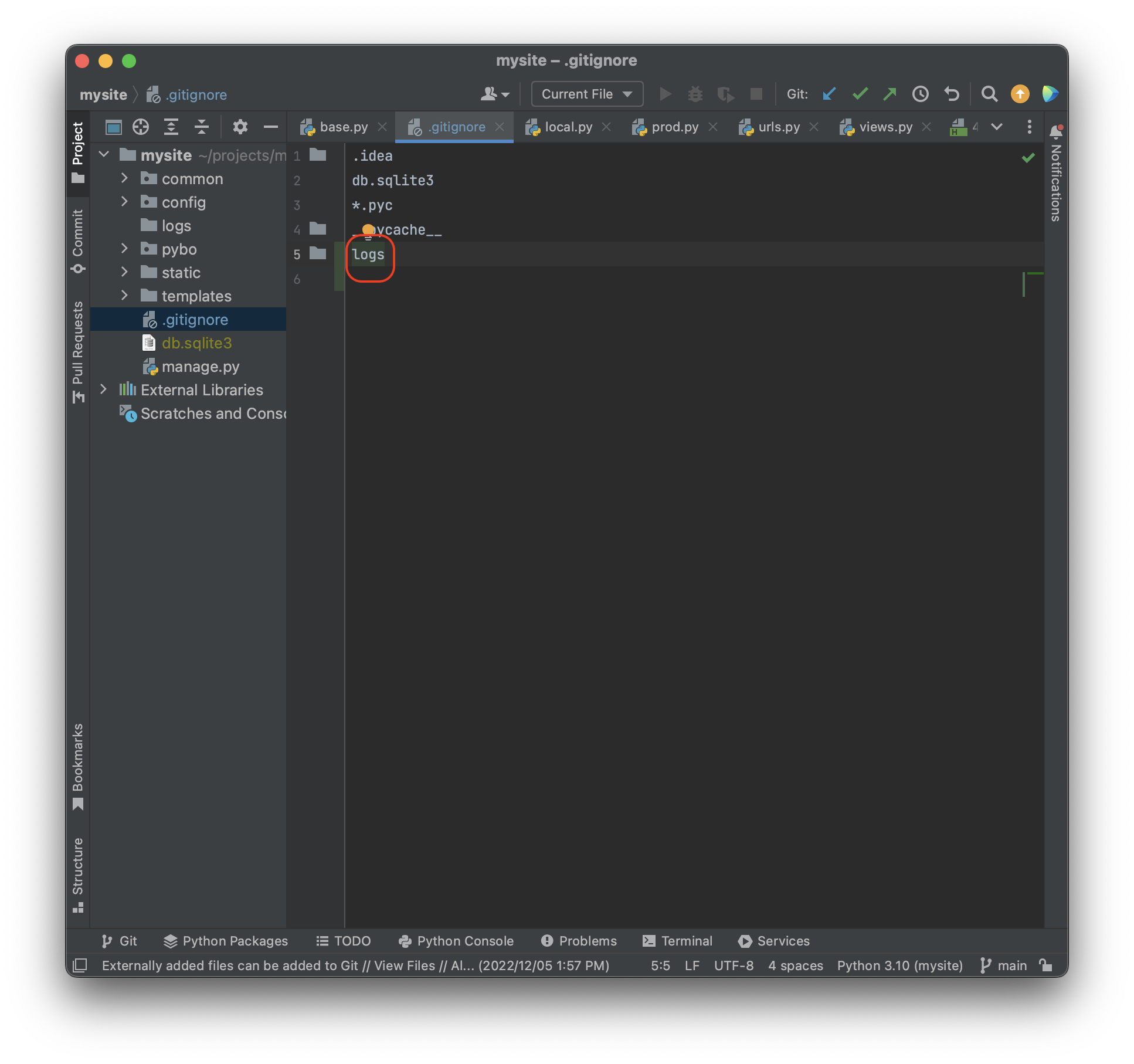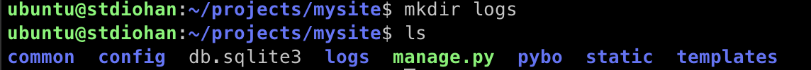 개발환경에서도 projects\mysite\logs 디렉토리를 만들어주자. 그리고 logs 디렉토리는 버전 관리 대상이 아니므로 .gitignore 파일에 logs 디렉토리를 추가하자.