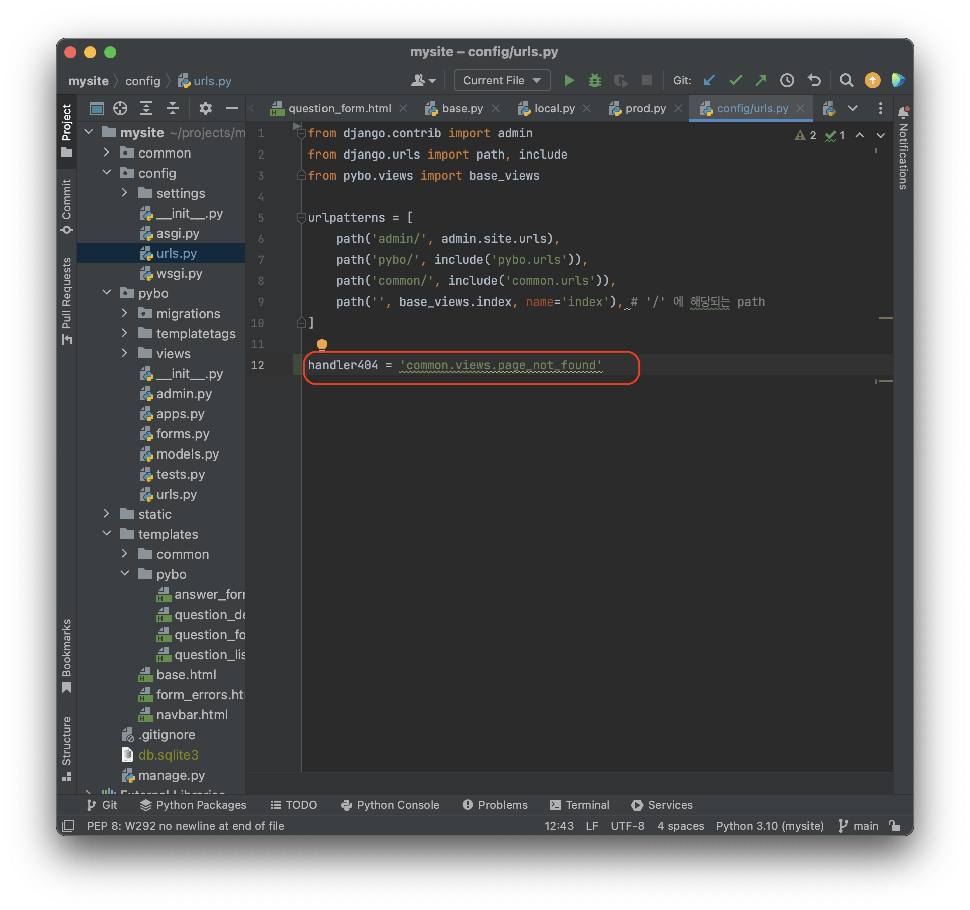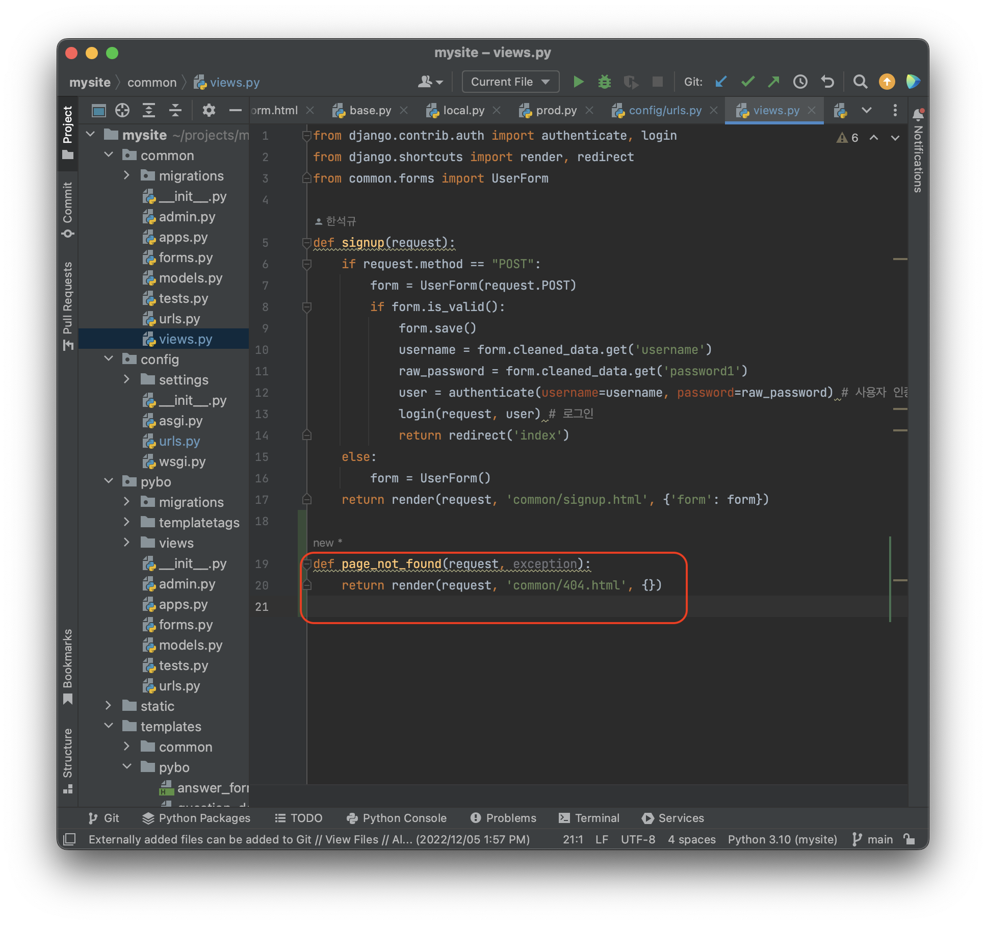 handler404 변수를 설정하면 404 오류 발생 시 사용자가 정의한 뷰 함수가 호출된다. 우리는 적어 넣은대로 common/views.py 파일의 page_not_found 함수가 호출될것이다. 이 handler404 변수는 반드시 config\urls.py 에 등록해야한다. common\urls.py 같은 곳에 등록하면 작동하지 않는다. 호출할 함수를 설정했으므로 이제 그 함수를 정의해보자.