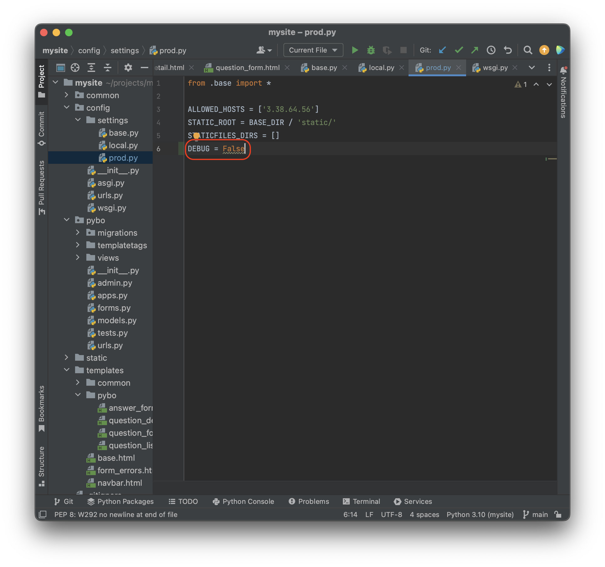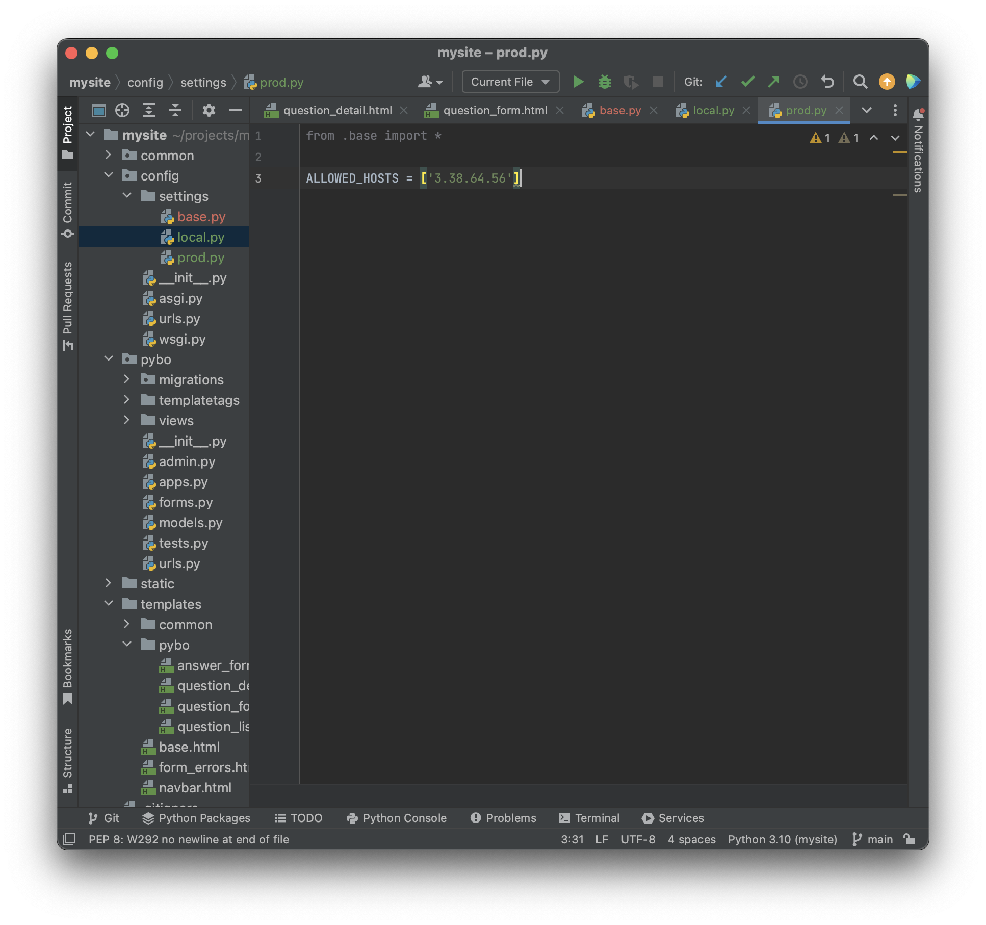 projects\mysite\config\settings\prod.py 파일을 새로 만들어주고 다음과 같이 작성해주자.