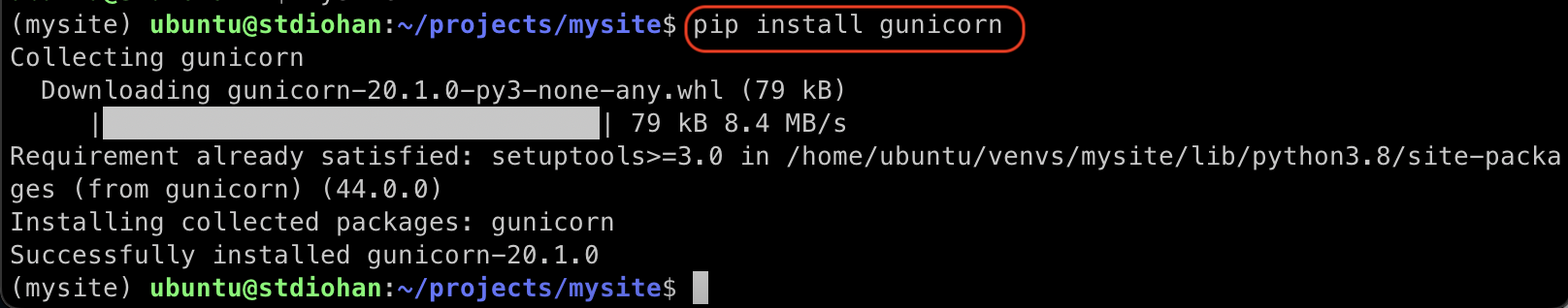 구니콘은 서버에 필요한 도구이므로 서버 환경에 설치하자. AWS에 접속한 뒤 pip install gunicorn 명령을 해 설치하자.