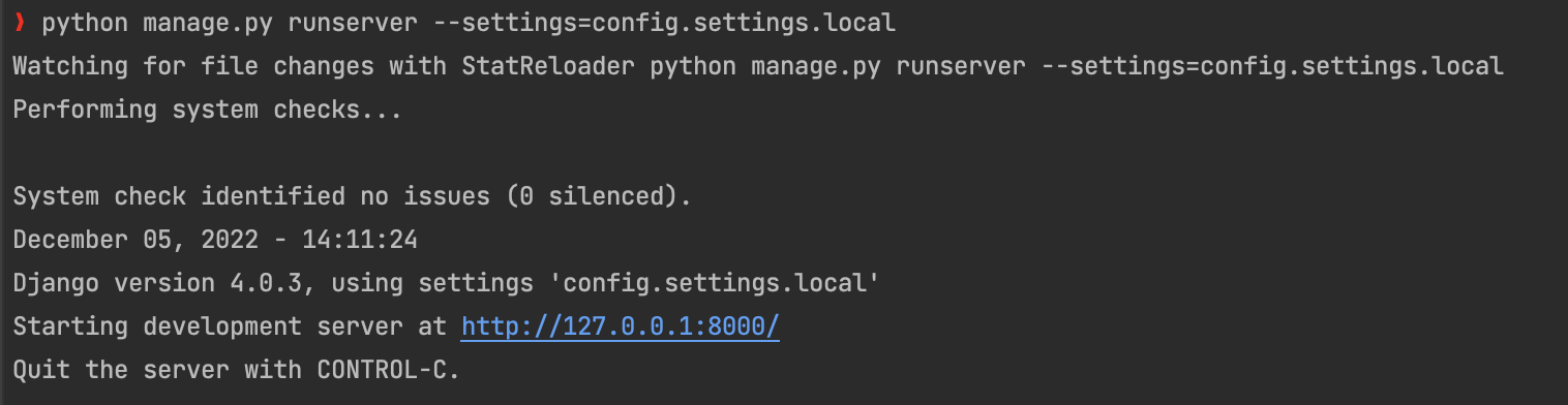 python manage.py runserver 뒤에 --settings=config.settings.local 이라는 옵션을 주었다. --settings 옵션은 장고서버가 읽어야할 설정파일을 지정하는 옵션이다. 그 뒤에적힌 명령어는 config\settings\local.py 를 읽으라는 뜻이다.