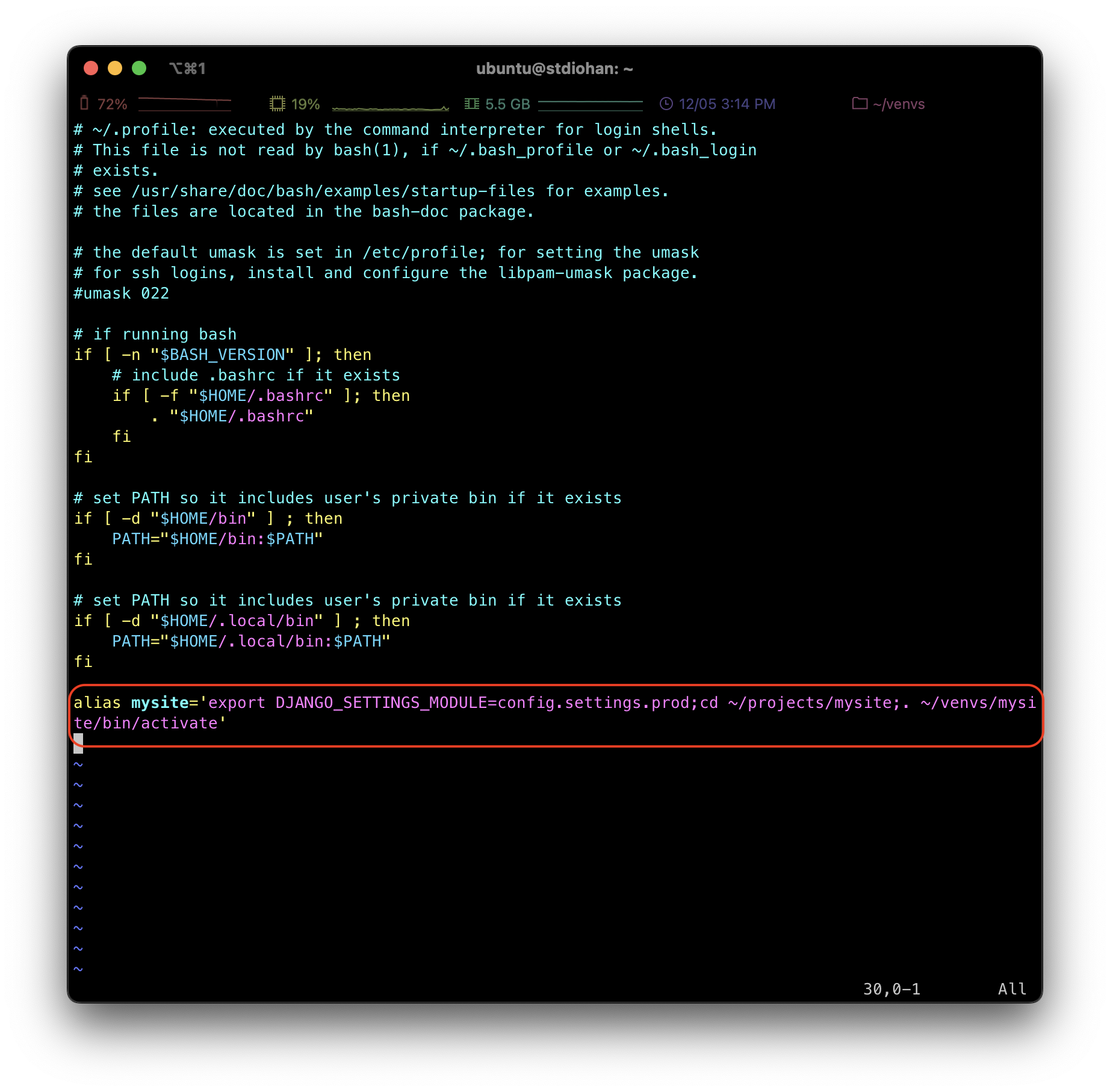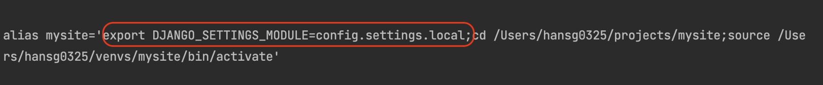 이렇게 .profile 파일을 수정하고 터미널을 종료후 다시 켜서 아무데서나 mysite 를 입력하면 자동으로 가상환경으로 진입한다. 그리고 서버구동시 옵션을 추가할 필요도 없어진다.