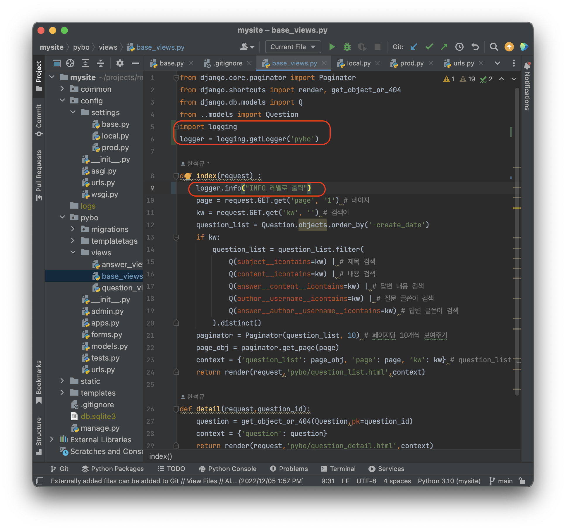 적어 뒀었던 3/0 강제오류 코드를 지우고 사진과 같이 수정하자. 로그 파일에 로그를 출력하기 위해서는 logging 모듈이 필요하다. logger = logging.getLogger('로거명') 으로 얻은 logger 객체를 이용해 logger.debug, logger.error, logger.warning 등의 함수를 이용해ㅑ 로그를 출력할 수 있다. 이렇게 설정해도 'INFO 레벨로 출력' 이라는 문장은 로그로 출력되지 않는다. 그 이유는 위 코드에서 사용한 pybo 라는 로거는 LOGGING 설정에 등록되지 않은 상태이기 때문이다.