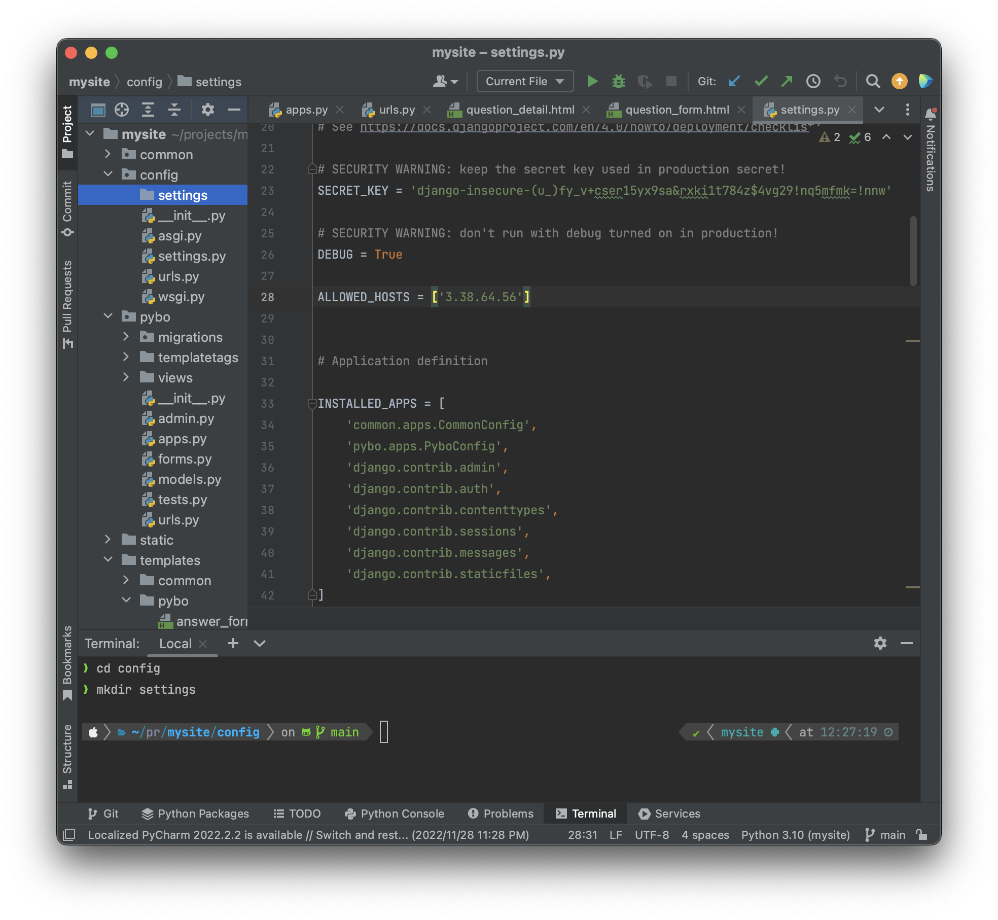 projects\mysite\config\settings\local.py 를 만들어준다.