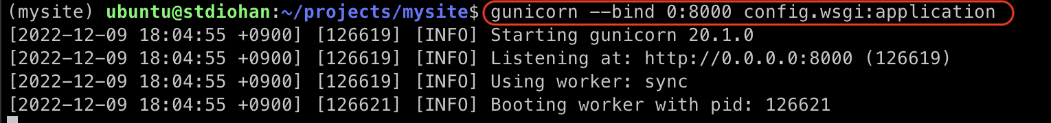 /projects/mysite 디렉토리로 이동한 뒤 명령을 실행했다. 해석해보자면 --bind 0:8000 은 8000번 포트로 WSGI 서버를 수행한다는 의미이다. config.wsgi:application 은 WSGI 서버와 연결된 WSGI 어플리케이션은 config/wsgi.py 파일의 어플리케이션이라는 의미이다.