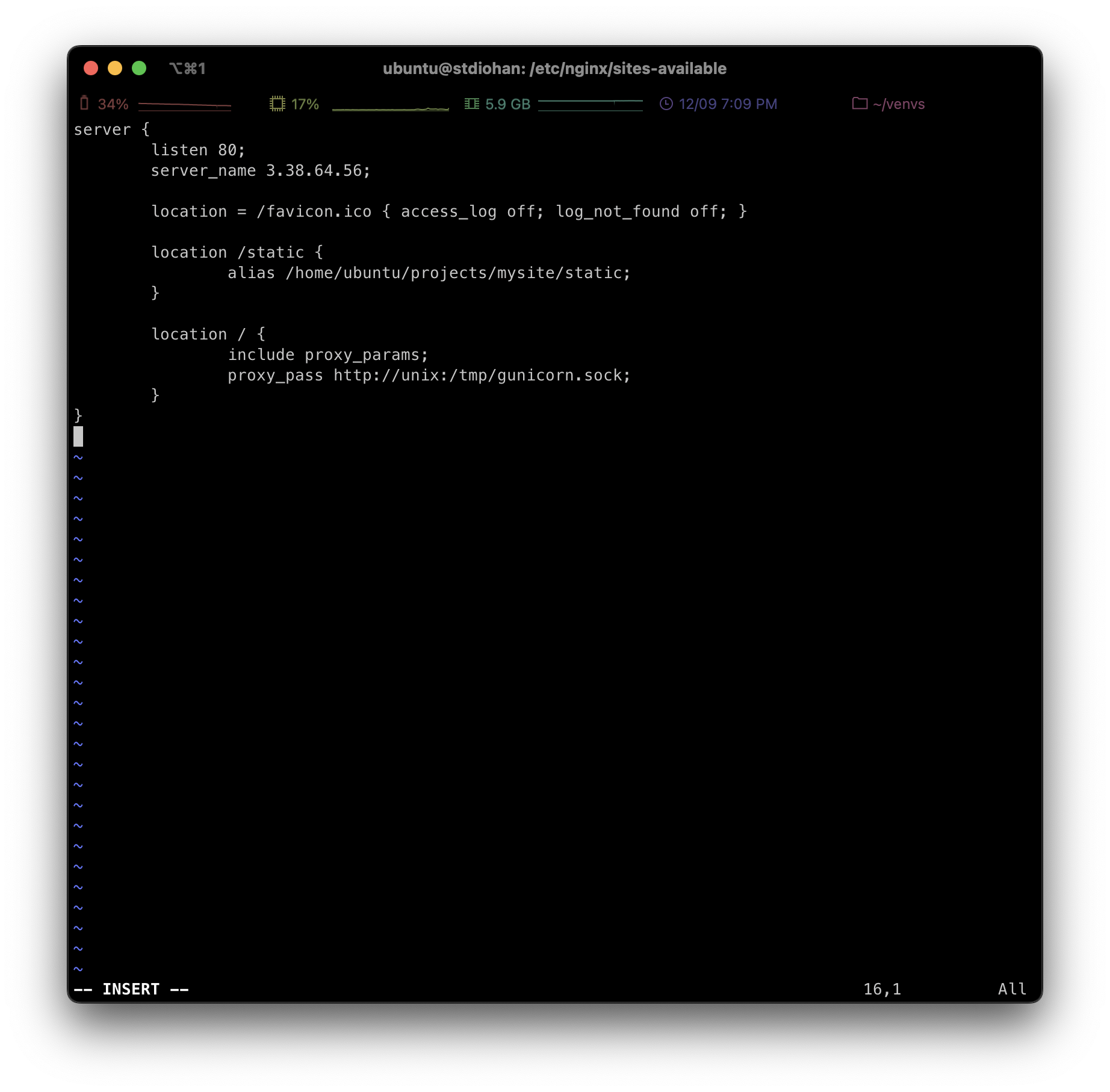 location /static 은 종적 파일에 대한 설정으로 /static 으로 시작되는 url 요청은 엔진엑스가 /home/ubbuntu/projects/mysite/static 디렉토리의 파일을 읽어서 처리한다는 설정이다.