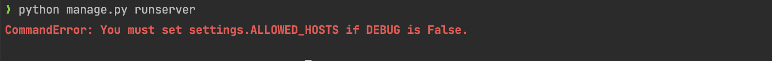python manage.py runserver --settings=config.settings.prod 라고 해야한다. 서버 환경을 구동해서 파이보에 접속해보면 오류가 발생한다. 서버환경으로 구동하는. 파일 prod.py 에는 ALLOWED_HOSTS 에 서버의 고정아이피가 등록되어있기 때문이다.